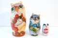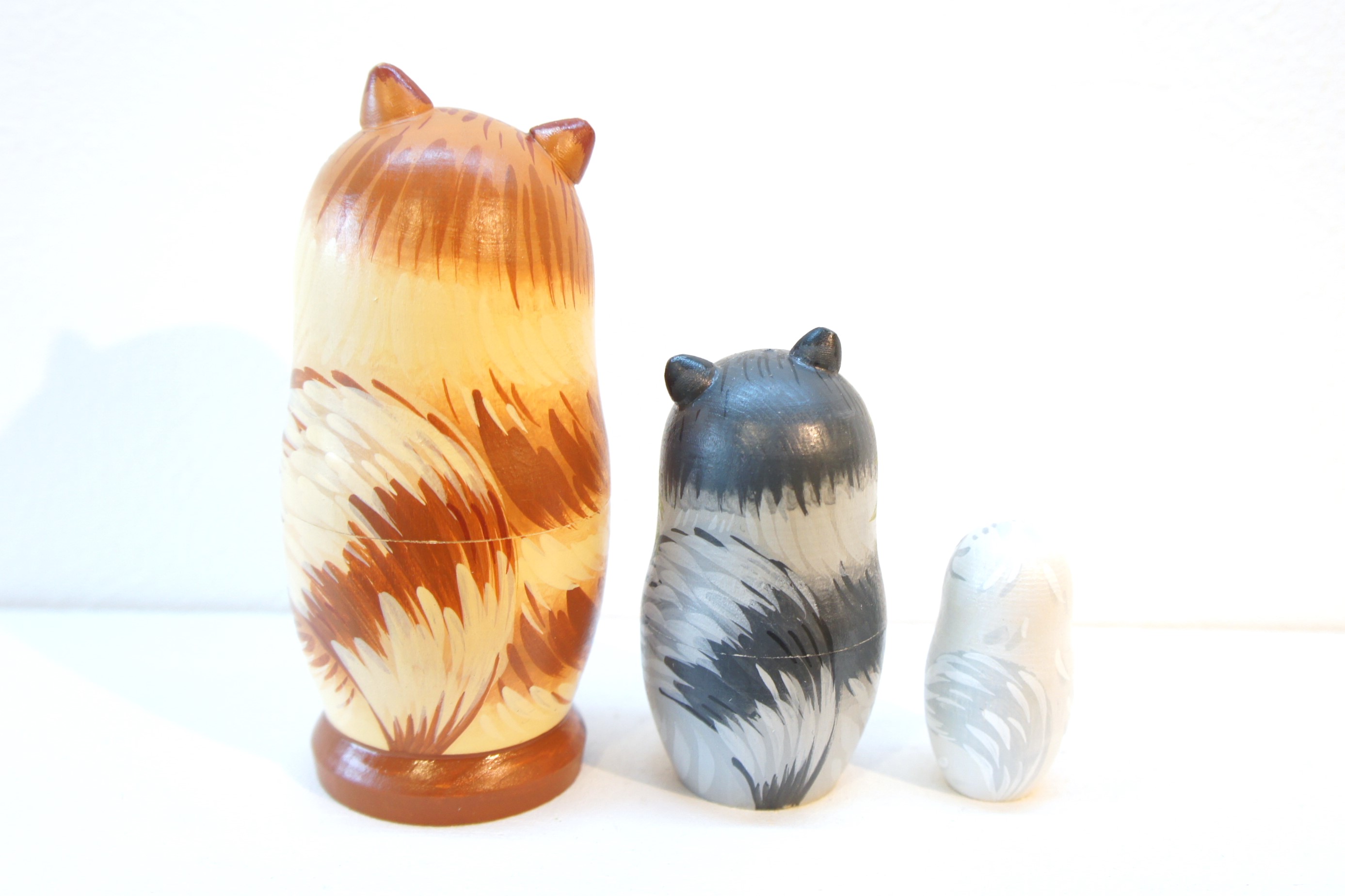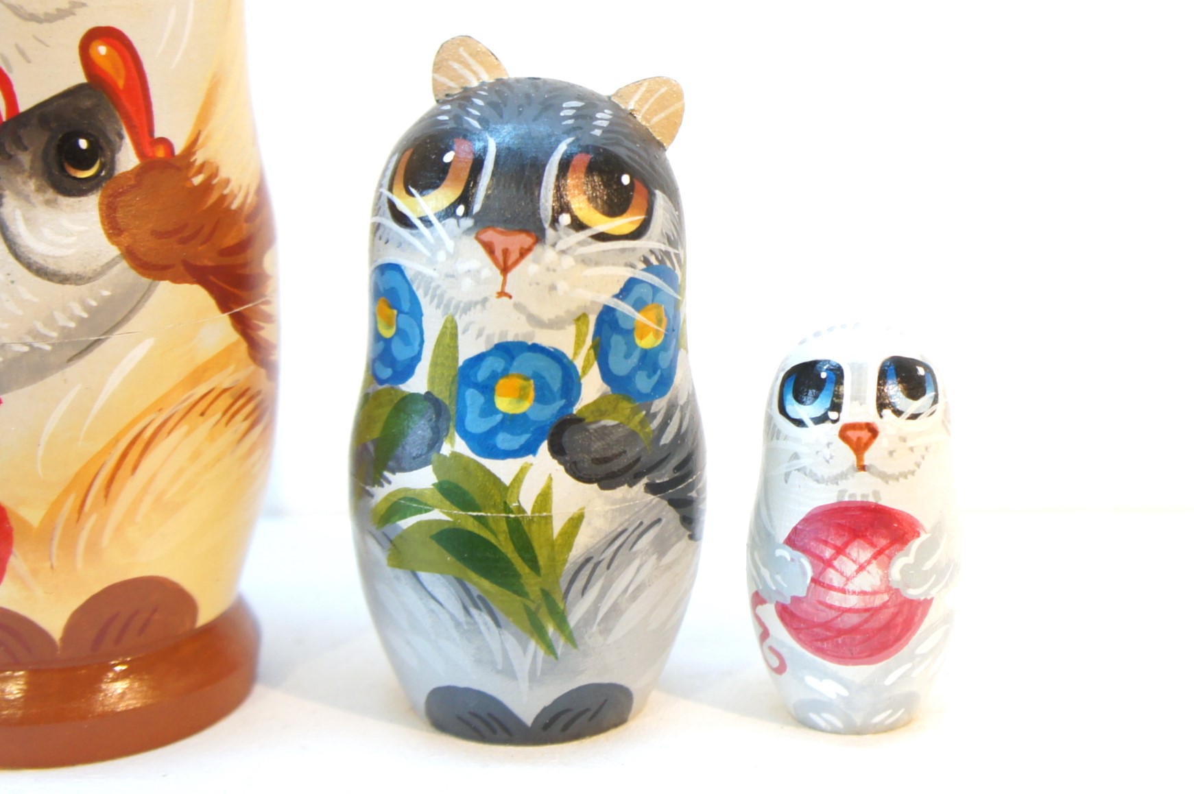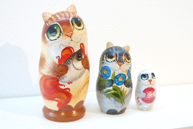 1番目と2番目のネコは立体的な耳があり、それぞれのネコの瞳の色が違います。表情もとってもかわいいほのぼのとしたマトリョーシカです。