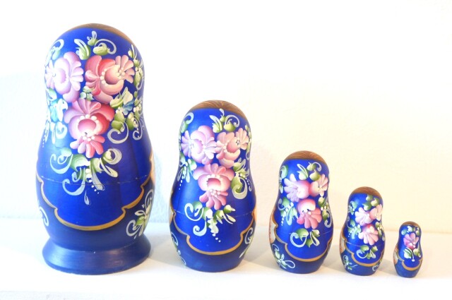 たくさんの花で彩られた、アンナ・バスカーカヴァさん作 マトリョーシカ <マーガレット・青> 5ピース です。オリガさんとアンナさんのバスカーカヴァ姉妹はどちらもマトリョーシカ作家さん。この作品はアンナさん作です。