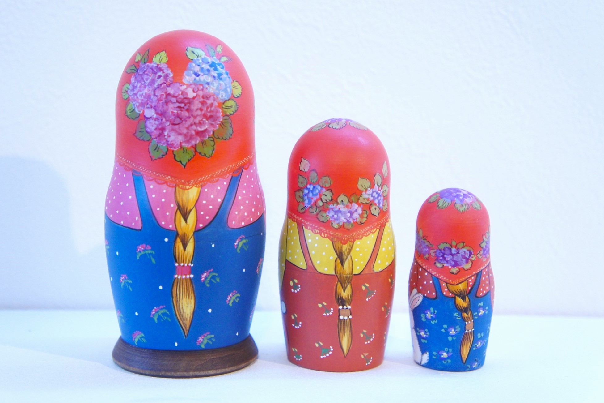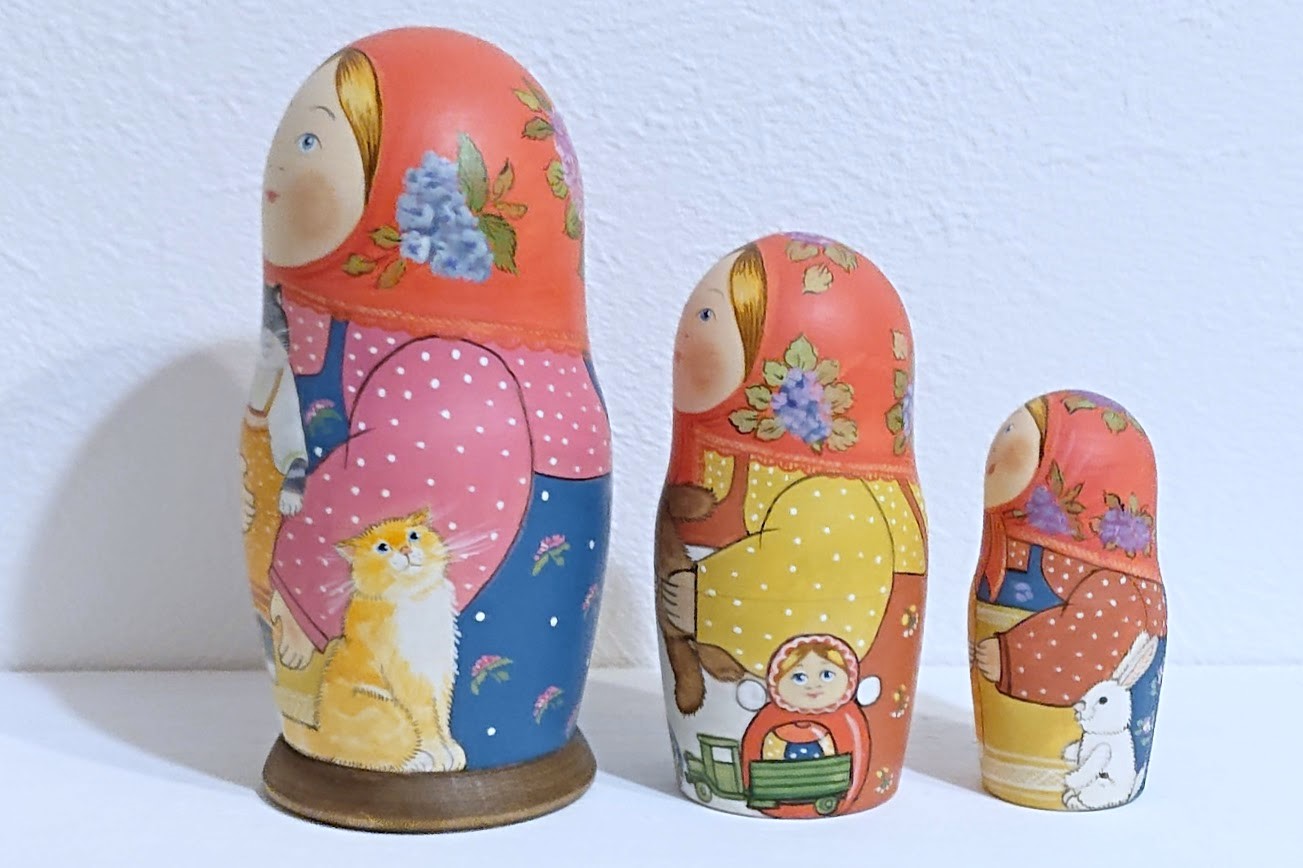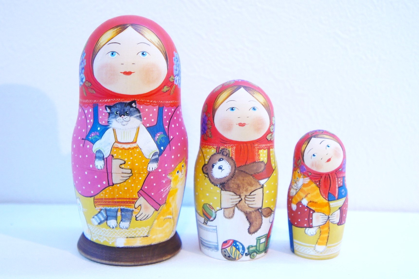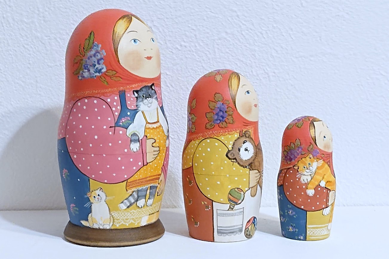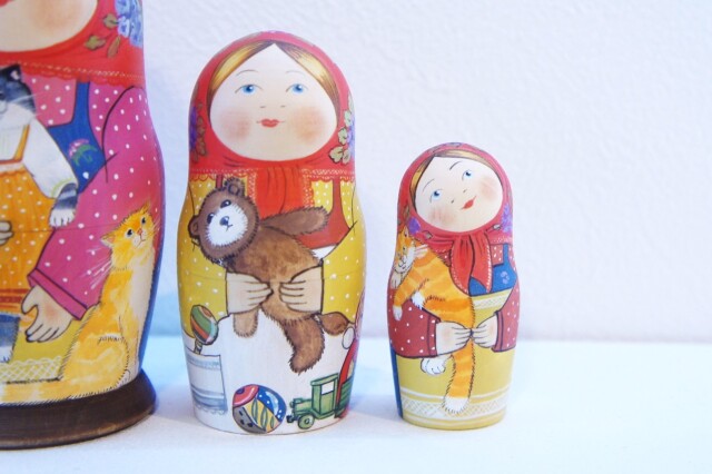 サイドや後ろ姿も見逃せません!子ネコちゃんやウサギのぬいぐるみが描かれています。ネコちゃんたちの表情やしぐさも生き生きと描かれています。ネコ好きの方にはたまらないマトリョーシカです。