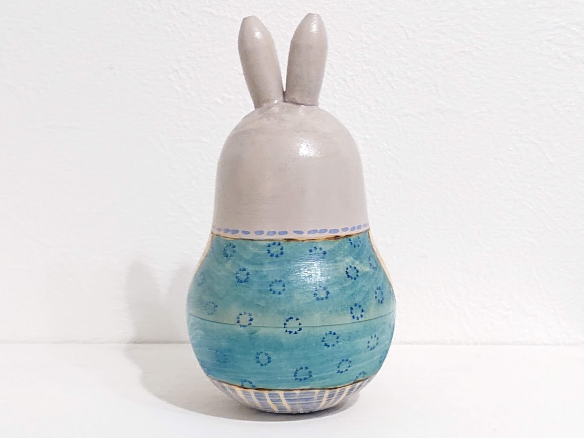 揺らすとカランコロンといい音色がする、ドゥビニッチさんのウッドバーニング・耳付きネヴァリャーシカ(起き上がりこぼし)<赤ちゃん>です。ウサギの耳の帽子をかぶっています。