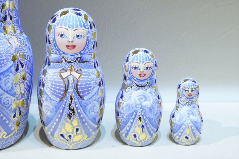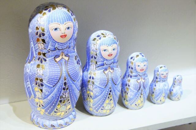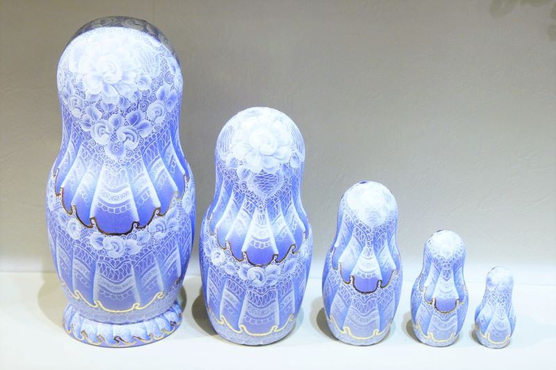 マリア様をイメージしているそうなのですが、お顔立ちが少し東洋的なので観音様のようにも見えます。青い瞳と赤い唇が魅力的…。やさしく微笑んだマトリョーシカたちに癒されます。