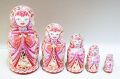 マリア様をイメージしているそうなのですが、お顔立ちが少し東洋的なので観音様のようにも見えます。青い瞳と赤い唇が魅力的…。やさしく微笑んだマトリョーシカたちに癒されます。