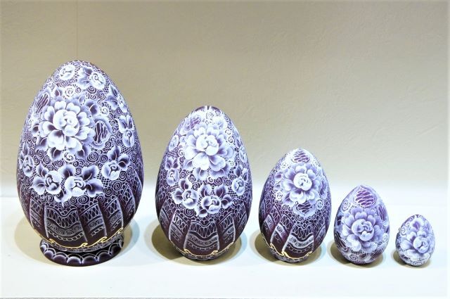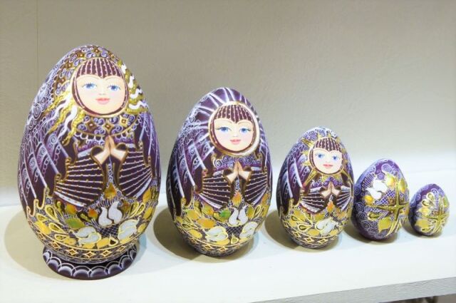 キラキラと光り輝く、フィラートヴァさんの「祈り」キラキラ!卵型マトリョーシカ 5ピース <バーガンディー>です。深みのある赤紫色が美しい作品です。