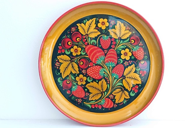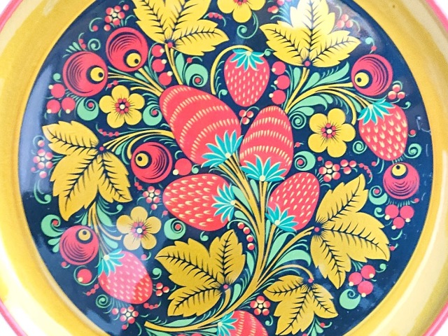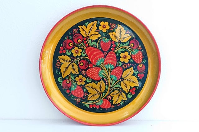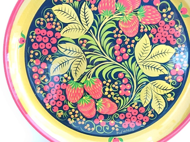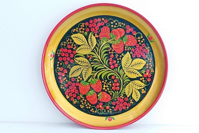塗料を塗った後、一度、特殊な高温の窯で焼いていますので、美しさが長持ち!ホフロマ塗りはロシアでは昔から食器として使われてきました。裏側には くぎ穴もありますので、壁にかけて絵のようにかざっても素敵です。
