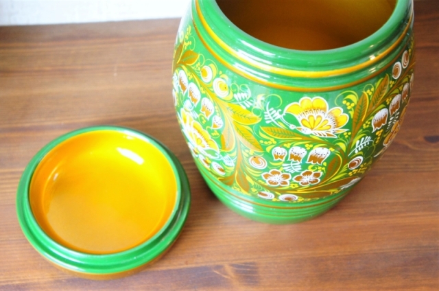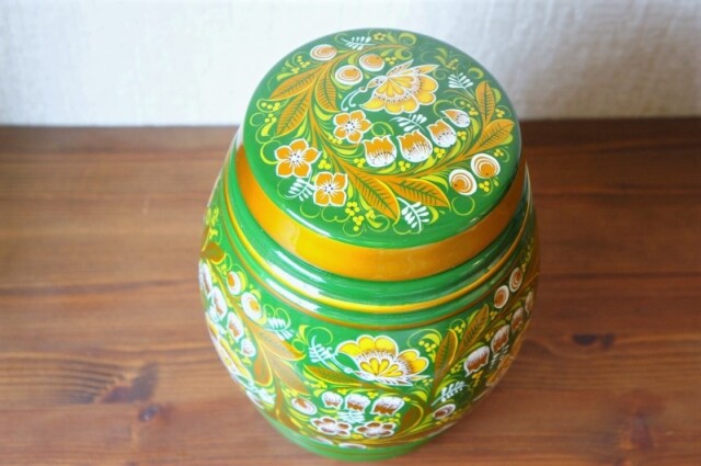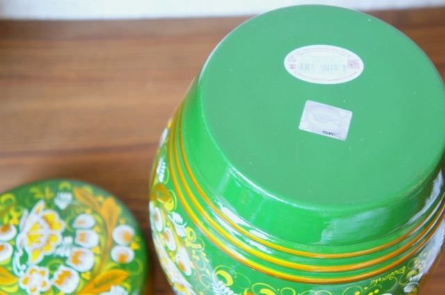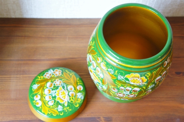 フタや本体に隙間なく描かれたスズランはロシアの昔のポピュラーソングにもあるように、人気の花。ベースの緑に黄色やゴールドが映えます。蝶々もところどころに描かれています。