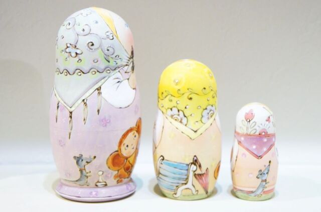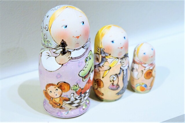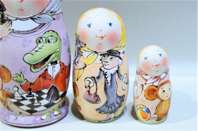 一番大きな女の子は黒いチェスのコマを右手に持っています。その前でチェブとゲーナがチェスで遊んでいます。2番目の女の子のところには、チェブラーシカとシャパクリャクばあさん、ドブネズミのラリースカがいます。3番目の女の子はチェブと一緒です。一番大きなマトリョーシカの後ろにはラリースカがいるのにもご注目!