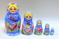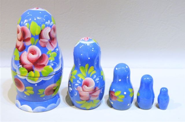 明るいブルーのボディに蝶々やバラの花が描かれているマトリョーシカ。まつげが長く、ぱっちりとした目が印象的なロシア美人さんたちです。大きなマトたちのかわいらしさも際立っていますが、小さなマトのキョトンとした表情もたまりません!!