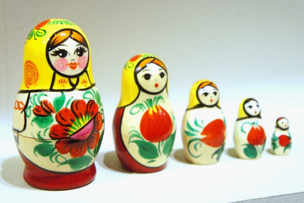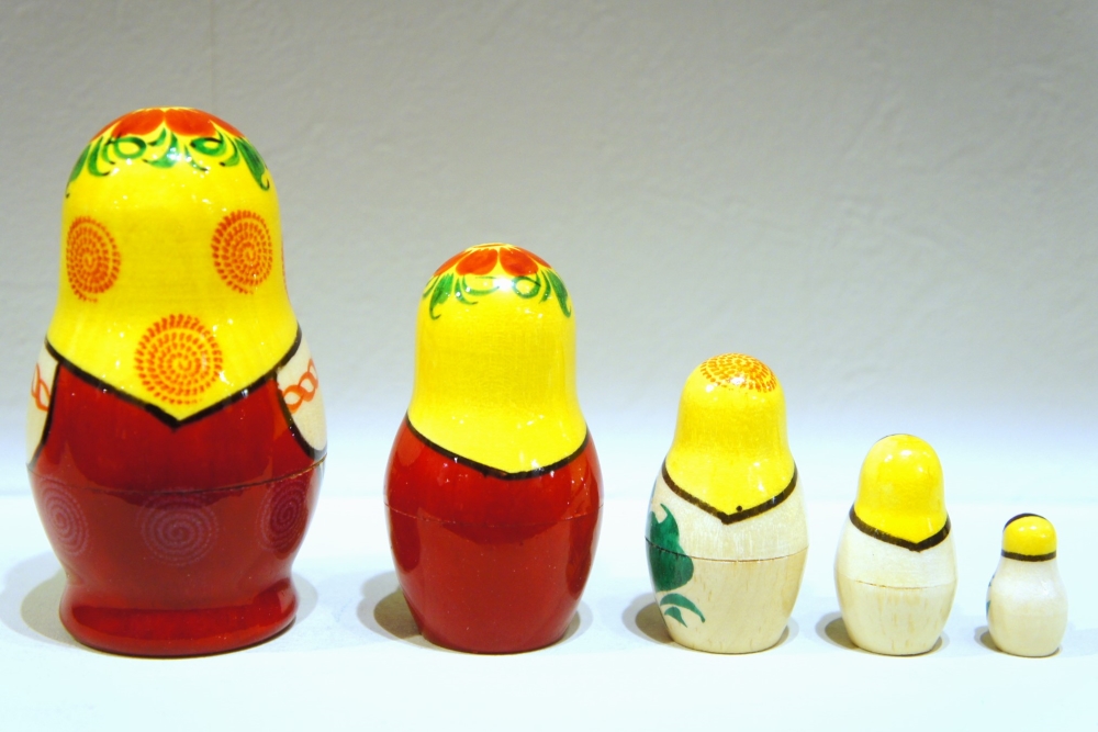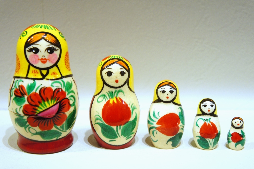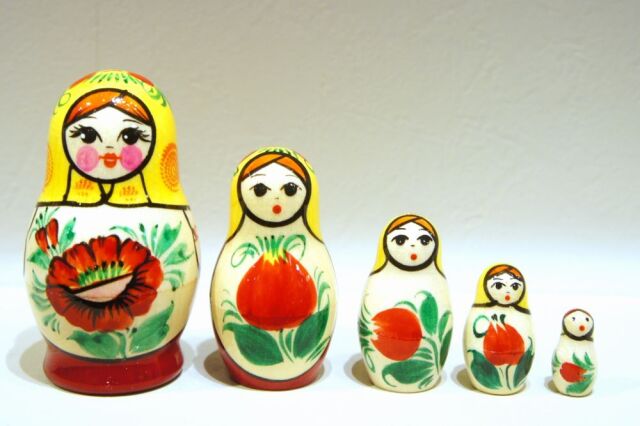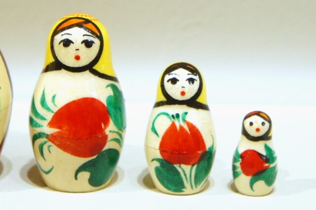 黄色頭巾をかぶったマトリョーシカ。女の子たちは赤い花の模様の服を着ています。大きなマトたちのかわいらしさも際立っていますが、小さなマトのキョトンとした表情もたまりません!!