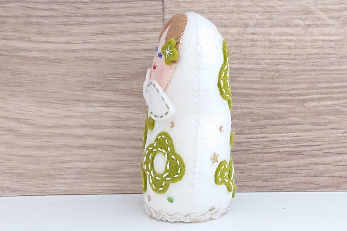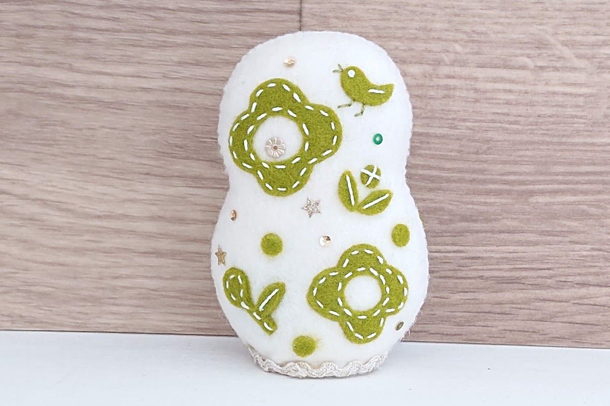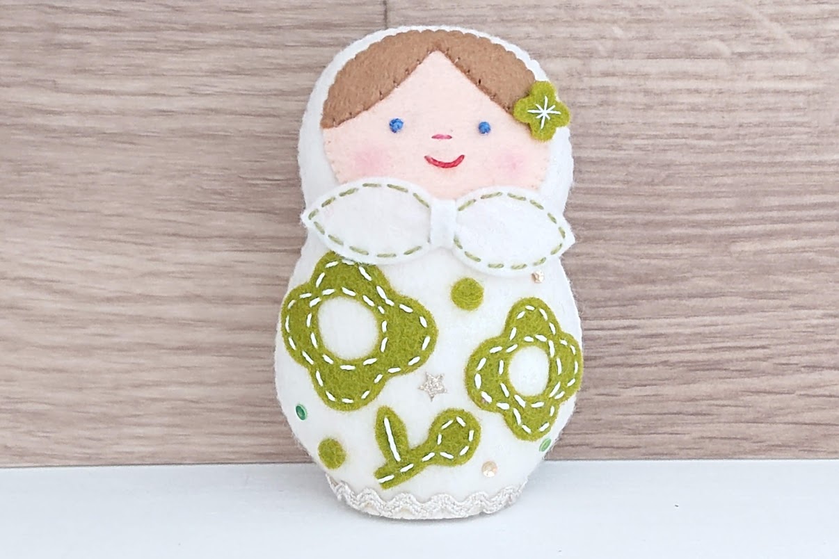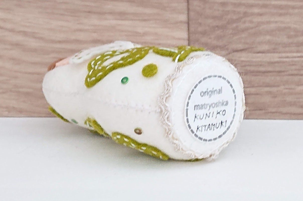 シートフエルト・マトリョーシカ作家、北向邦子(きたむき くにこ)さんのかわいい北向邦子作 シートフエルトマトリョーシカ <緑のお花のマトリョーシカ>です。