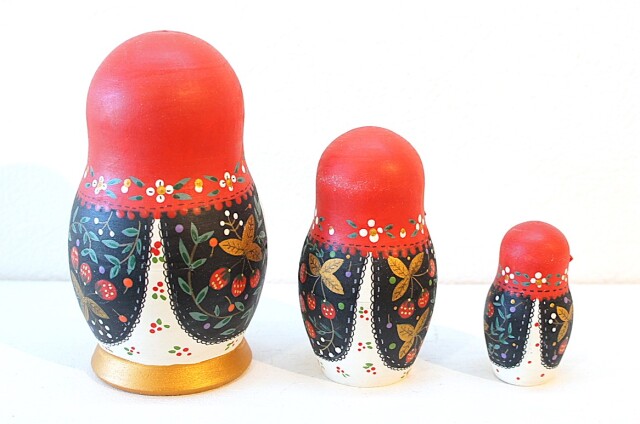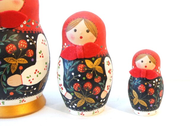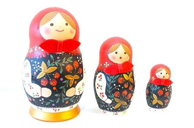 ロシア民芸の一つであるイチゴやベリー柄のホフロマ模様の衣装を着た3人娘たち。赤いプラトーク(頭巾)をかぶっています。プラトークを縛った端は、フエルトで立体的に作られています。