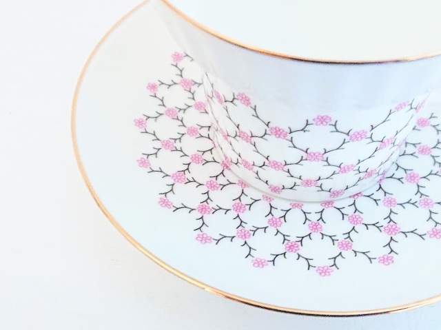 小さなピンクのバラが黒い葉でつながって、ネットのような模様として描かれています。朝顔のような形のカップはとってもかわいらしく、縁の金彩もアクセントになっています。