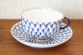 インペリアル・ポーセレンの代表作ともいえるこのパターンは、コバルトブルーの線と金の線を用い、ネット模様が描かれています。持ち手はコバルトブルーで金彩模様がアクセントになっています。