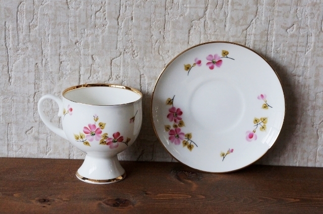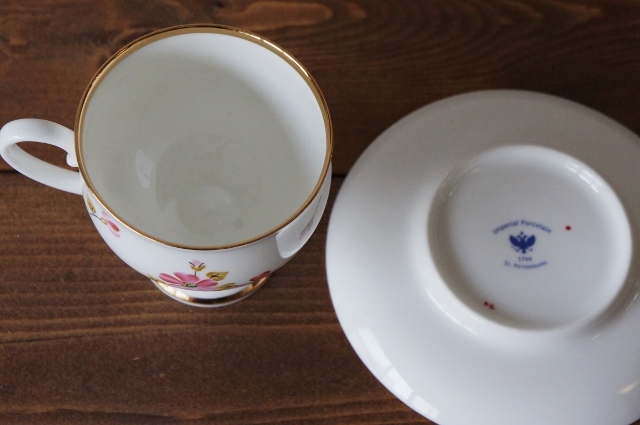 少し濃いめのピンクの花がとても可憐なパターン。「妖精のために」なんて素敵な名前ですね!でも本当に妖精がちょこんと金の縁に腰かけそうな、かわいらしい雰囲気のコーヒーカップ&ソーサーです。高台が高くなっているカップの形も上品な印象です。