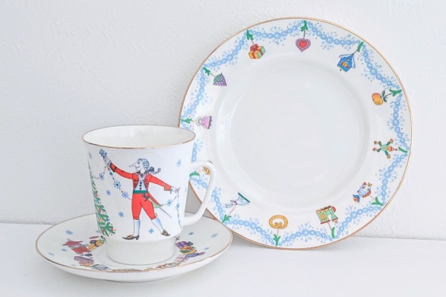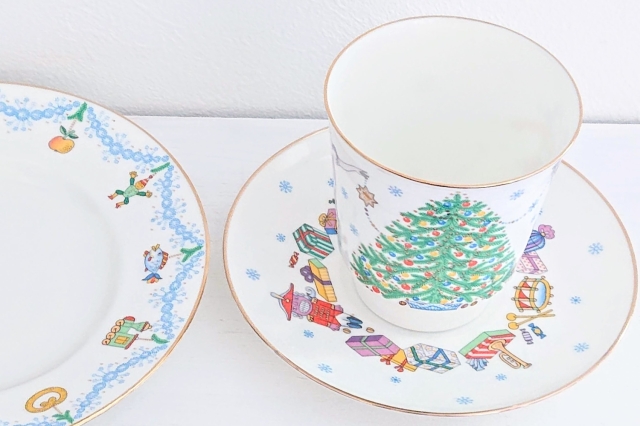 このトリオセットはバレエの世界そのままに、カップにクララと王子様とツリー、ソーサーやケーキプレートには、おもちゃや、お菓子がいっぱい描かれています。