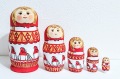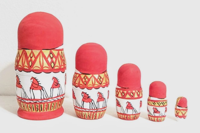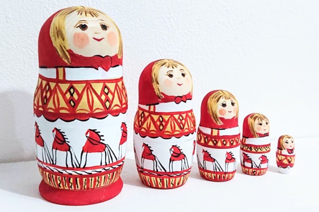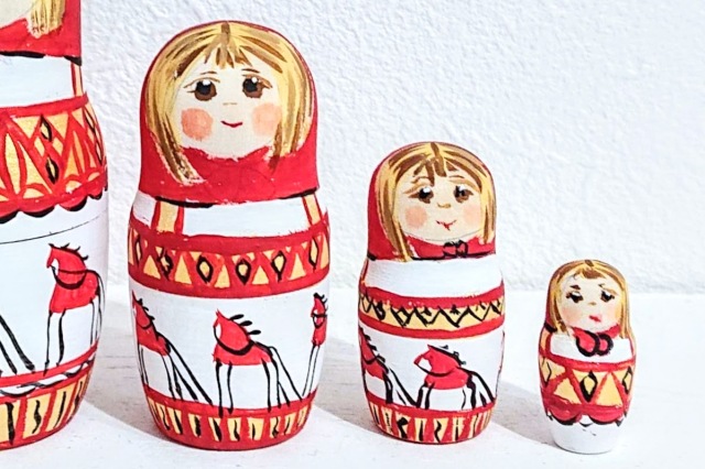 アルハンゲリスク地方の伝統的塗り物メゼーニ塗りを使って描いた、マルンコーヴァ作 メゼーニ塗り 赤ずきんちゃんマトリョーシカ Sサイズ 5ピース <馬>です。表情がなんとも癒し系で、見ていると思わず笑顔になってしまいます。