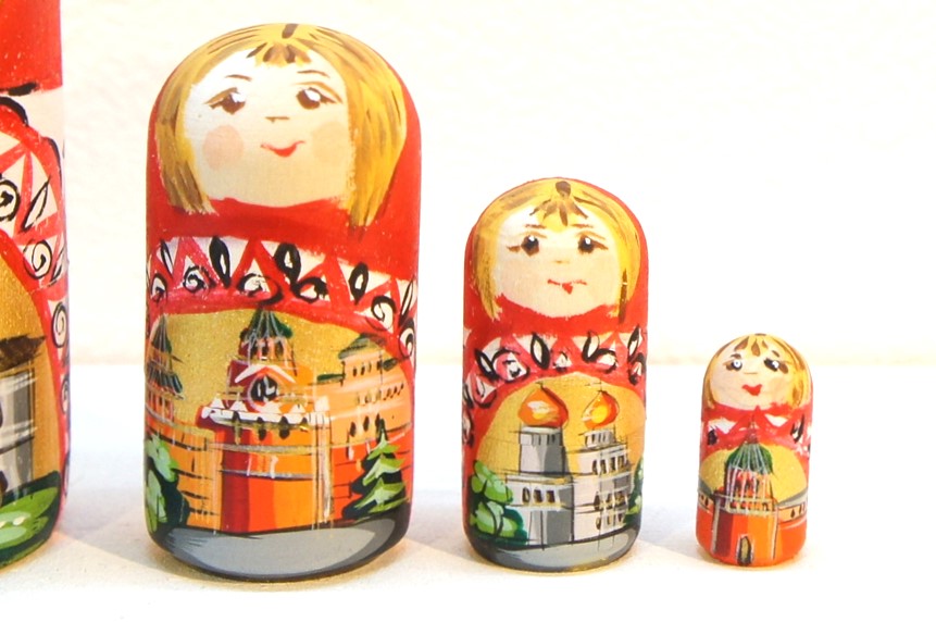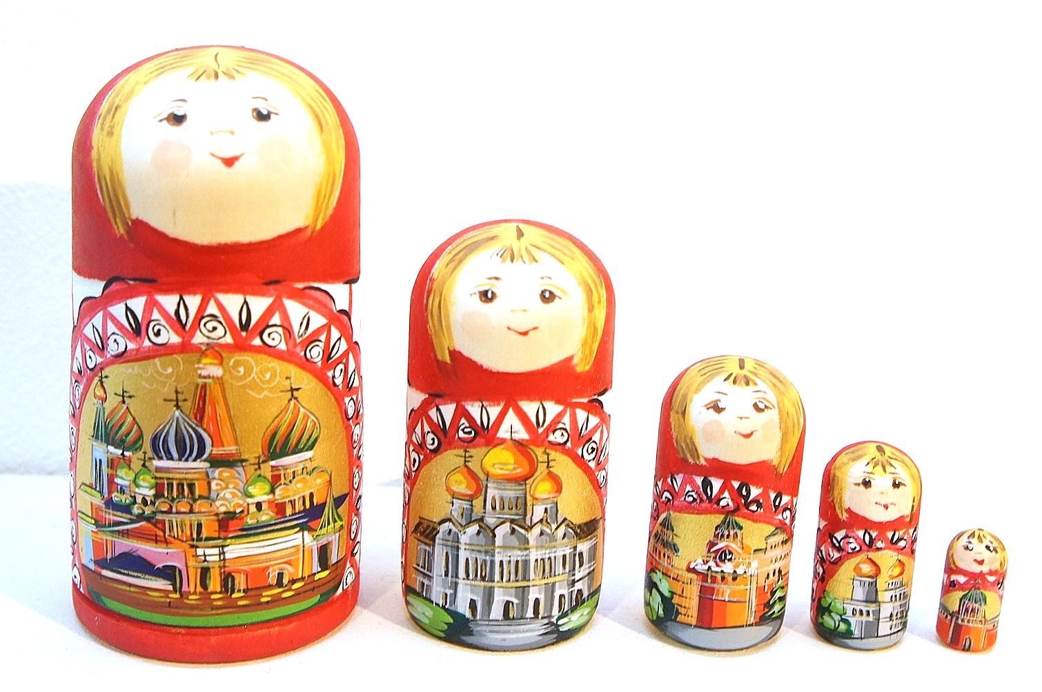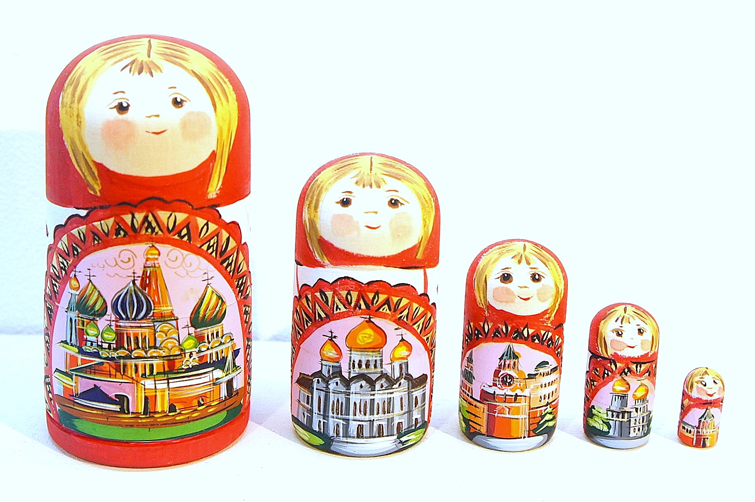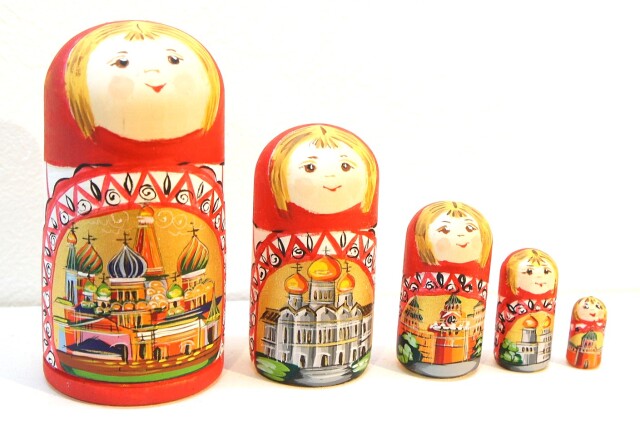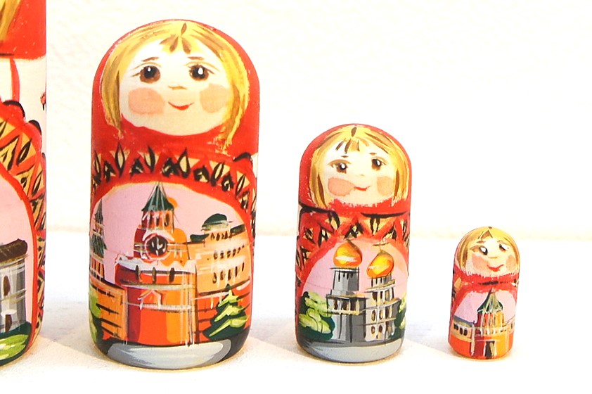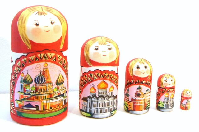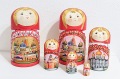 胴体のところにはモスクワの観光名所が描かれています。1番目のマトリョーシカには赤の広場にある聖ワシリー寺院、2番目には救世主キリスト聖堂、3番目にはクレムリンの時計があるスパスカヤ塔、4番目にはクレムリンの中にあるウスペンスキー大聖堂、5番目にはクレムリンのトロイツカヤ塔が描かれています。