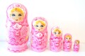 民族衣装マトリョーシカ 5ピース <グジェーリ模様・ピンク>です。ロシアの伝統工芸であるグジェーリ陶器のバラ模様のマトリョーシカです。