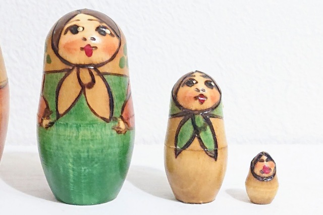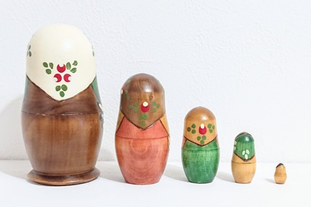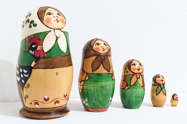 クラシカルな雰囲気!ウッドバーニング民族衣装マトリョーシカ 5ピースです。電熱ペンで木を焦がしながら輪郭線を描くウッドバーニング技法を使ったマトリョーシカで、ソ連時代の初期のマトリョーシカの雰囲気をかもし出しています。