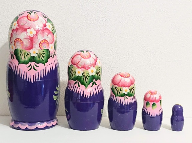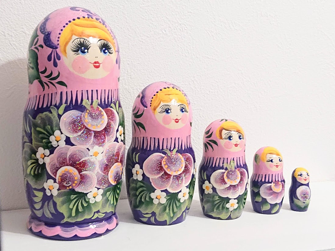 ピンク頭巾に紫の服を着たマトリョーシカ。赤紫色の花が華やかです。随所にラメが塗られていて華やかさを増しています。頭巾の後ろにも花が描かれています。