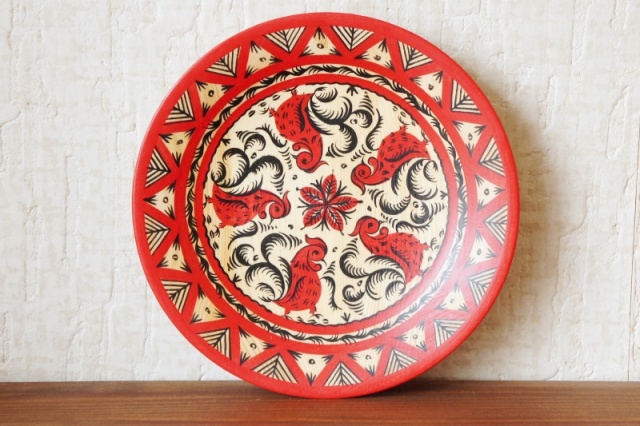 ロシア北部、アルハンゲリスク州に伝わる伝統工芸、ロシアの伝統的工芸 木製皿 <メゼーニ塗り><バロック塗り>です。木製無垢皿にアルハンゲリスク州に伝わる模様が描かれています。