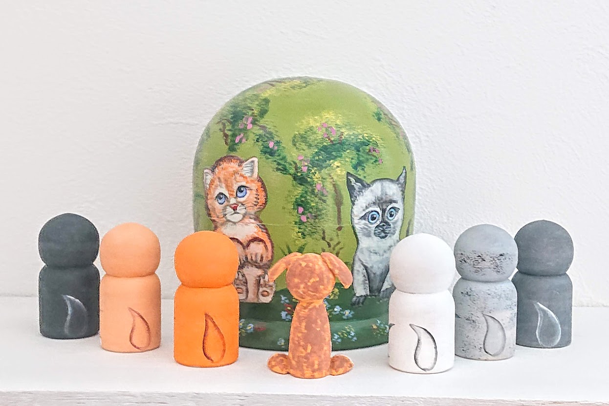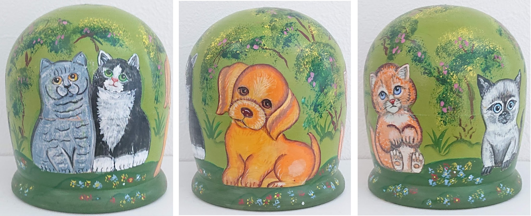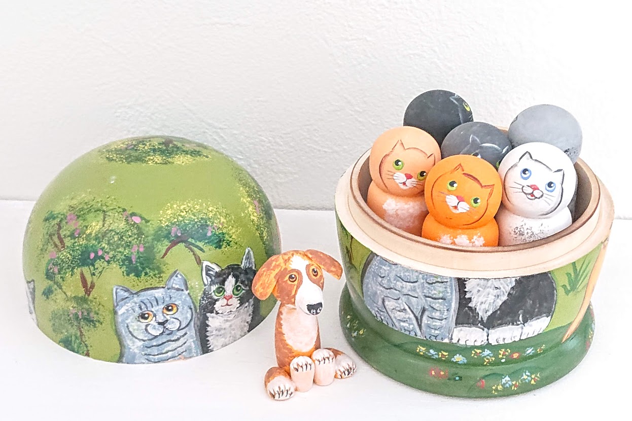ニキーチン工房作の「子ネコと子犬」ドーム型マトリョーシカ(S) 7+1ピースです。