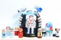 広い宇宙を遊泳!ニキーチン工房作の「宇宙旅行」 ドーム型マトリョーシカ(L) 14ピース+箱です。 広い宇宙空間を漂う宇宙飛行士たち。ロシア、日本、アメリカをはじめ、フランス、イタリアのesa(欧州宇宙機関)の宇宙飛行士たちが、仲良く宇宙旅行中です。人間より前に宇宙旅行に成功した、ライカ犬も一緒にいるようですよ!そして、ロシア人飛行士とСОЮЗ(ソユーズ/サユース)と書かれた宇宙船には棒がついていて、ドーム本体にある穴にさせば、なんと!宇宙遊泳させることが可能です。 ロシア、そしてソ連といえば、宇宙開発のパイオニア。世界で初めて有人飛行に成功したのもソ連でした。だから、このマトリョーシカには、先人の偉業に敬意を表し、ロシア人飛行士だけでなく「СССР」とヘルメットに書かれた、ソ連人飛行士もタイムスリップして乗っています。