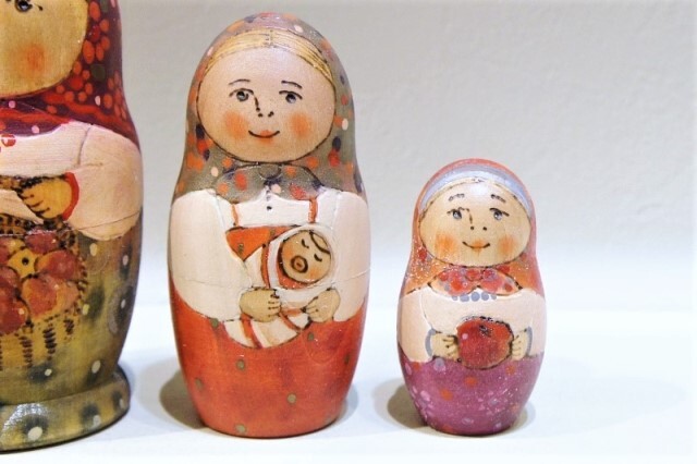 マトリョーシカたちの表情はとっても豊か。カラフルでやさしい色あいと、ウッドバーニングの素朴さがマッチした素敵な作品です。