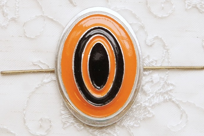 バッジの後ろにある2つの細い棒を帽子に刺して、裏で折り曲げて留めます。(布製帽子は2個穴を開けて、ウシャンカや制帽は1個穴を開けてから刺してください。)