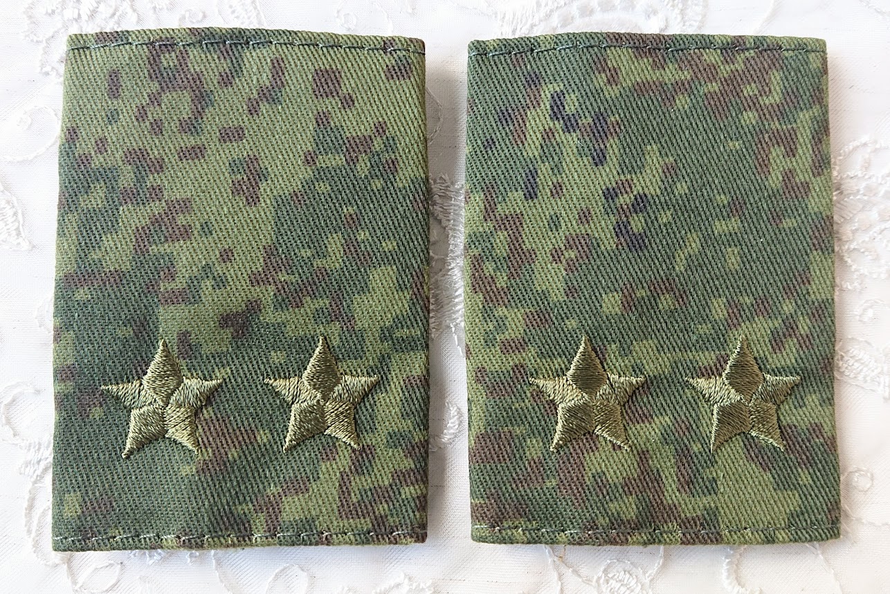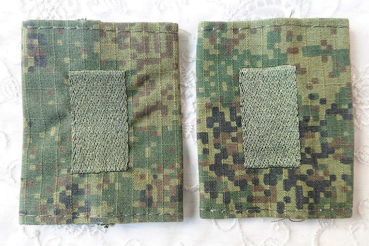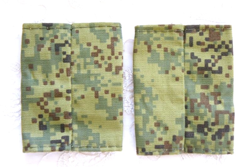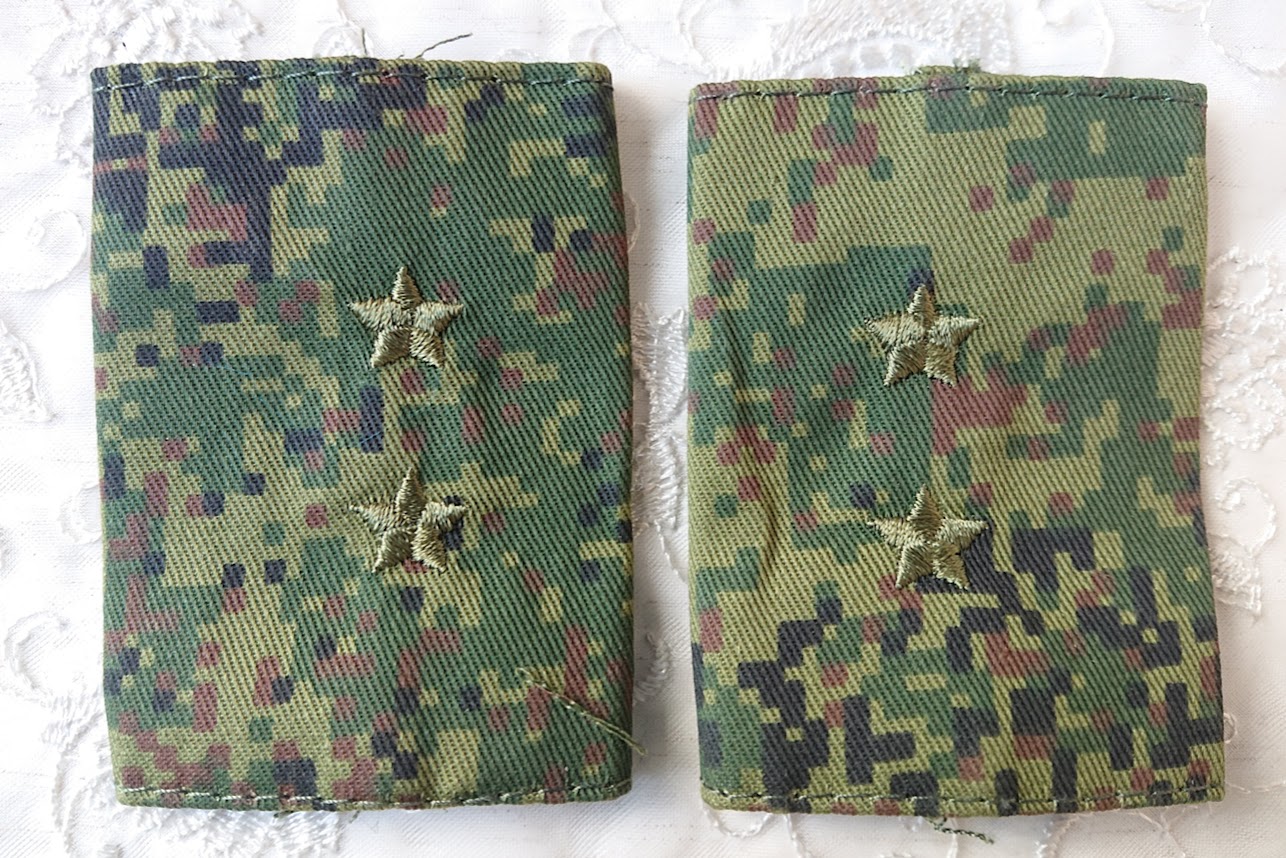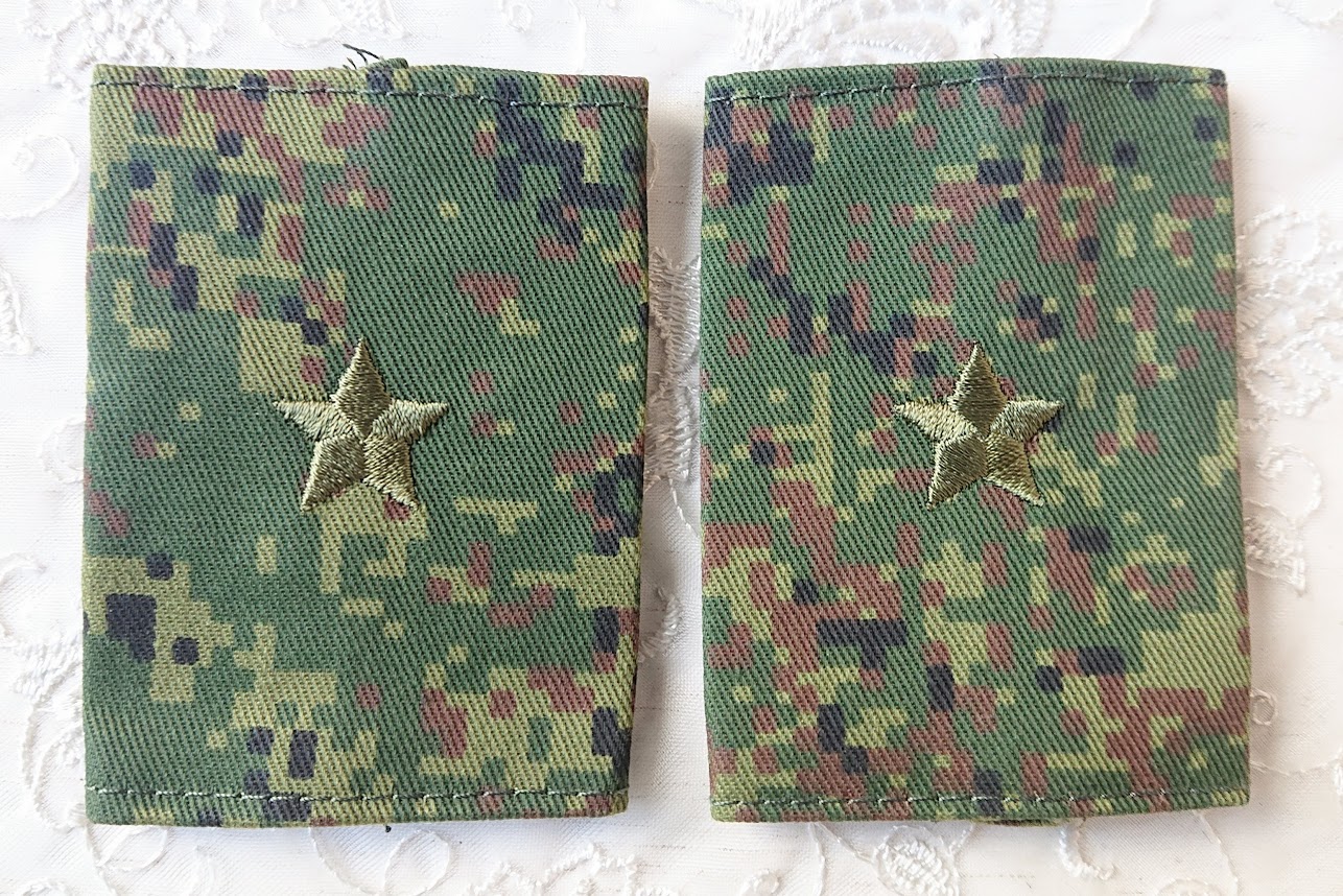 この肩章は戦地用のため、敵から目立たないようにデジタルフローラ迷彩地の土台にオリーブ色の星の刺繍がしてあります。