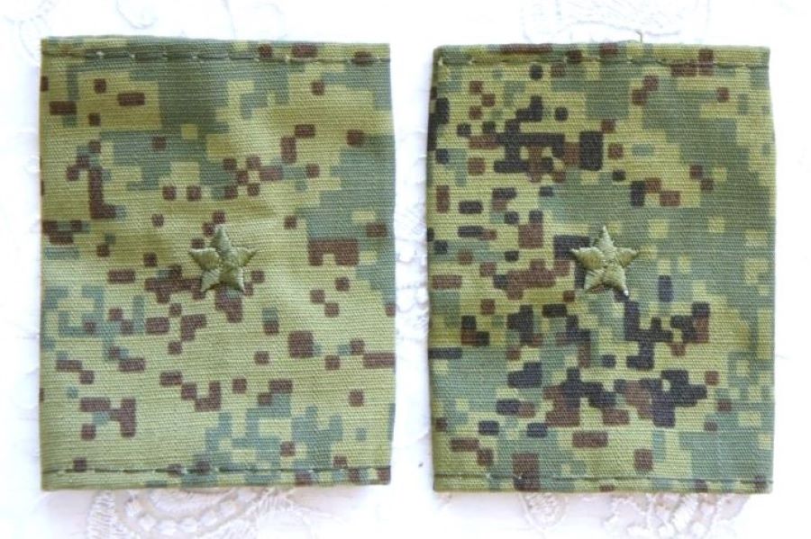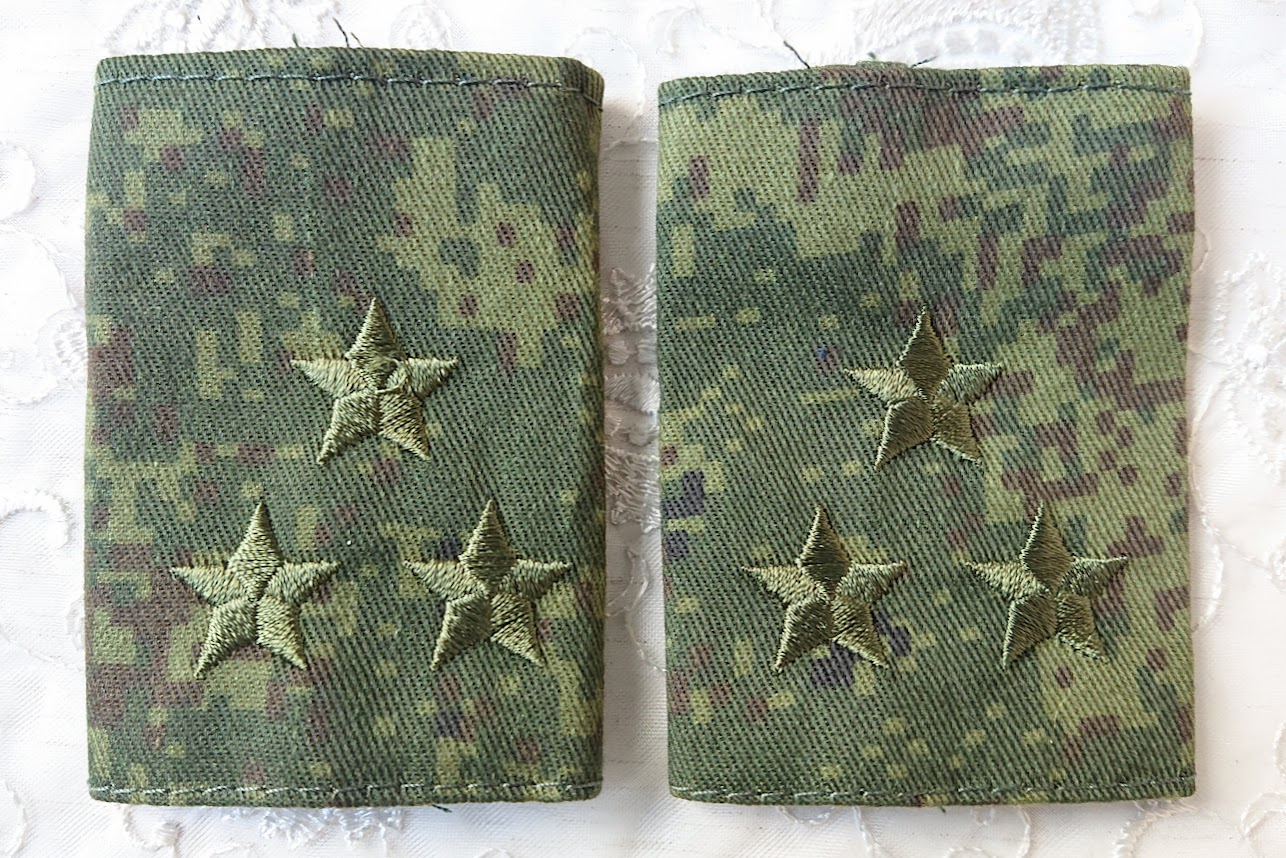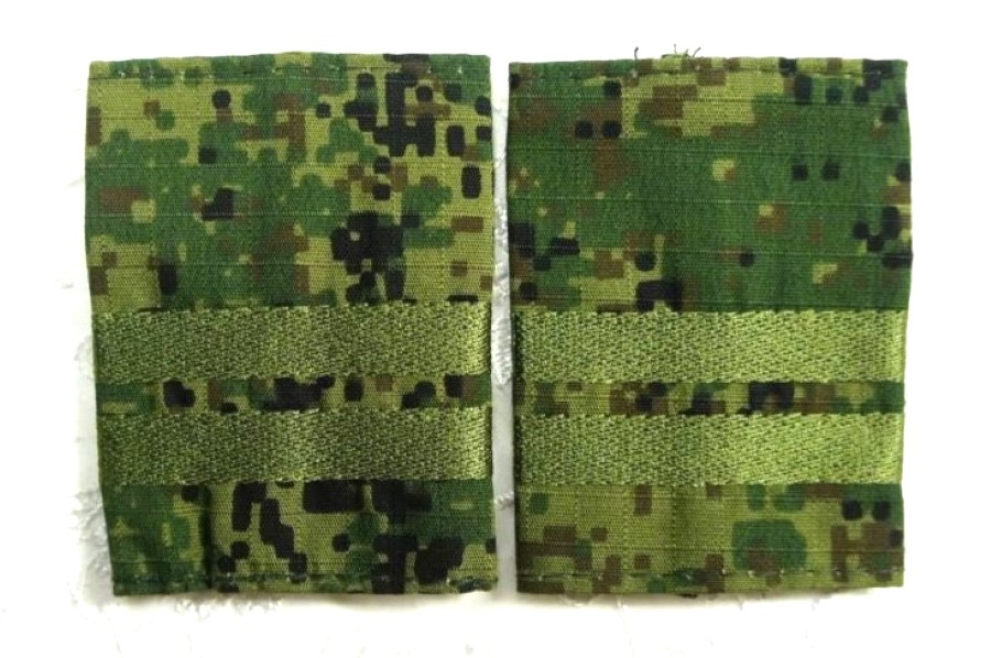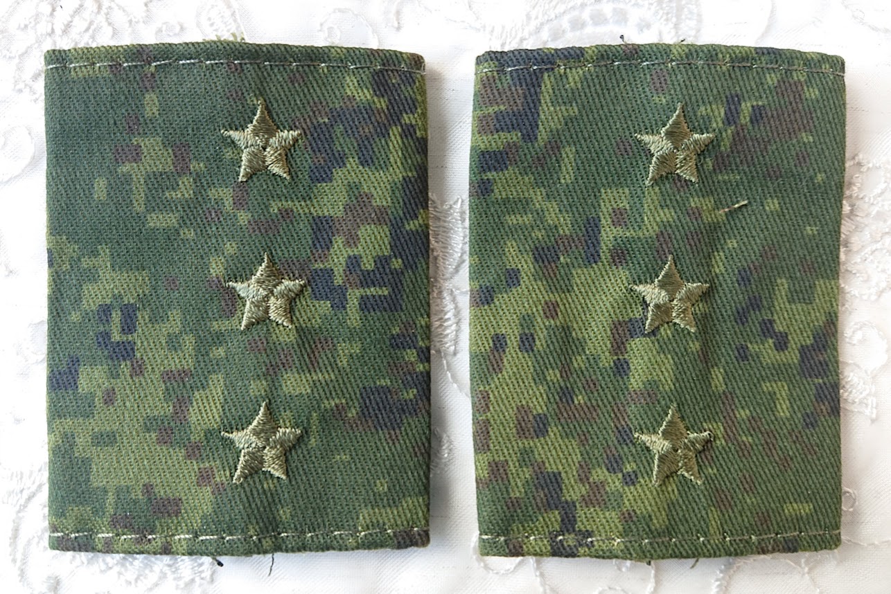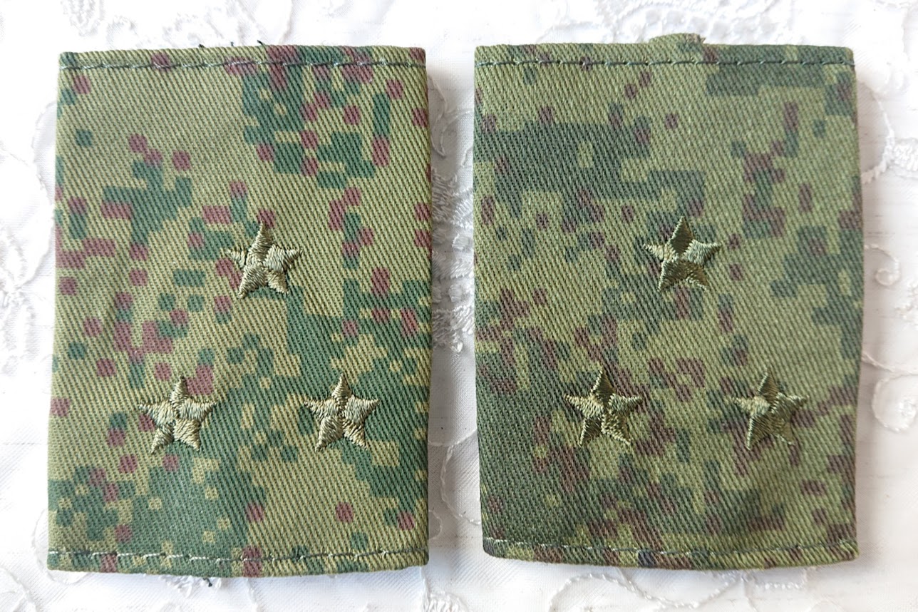 この肩章は戦地用のため、敵から目立たないようにデジタルフローラ迷彩地の土台にオリーブ色の星の刺繍がしてあります。