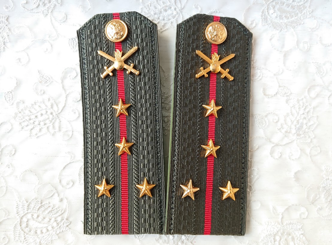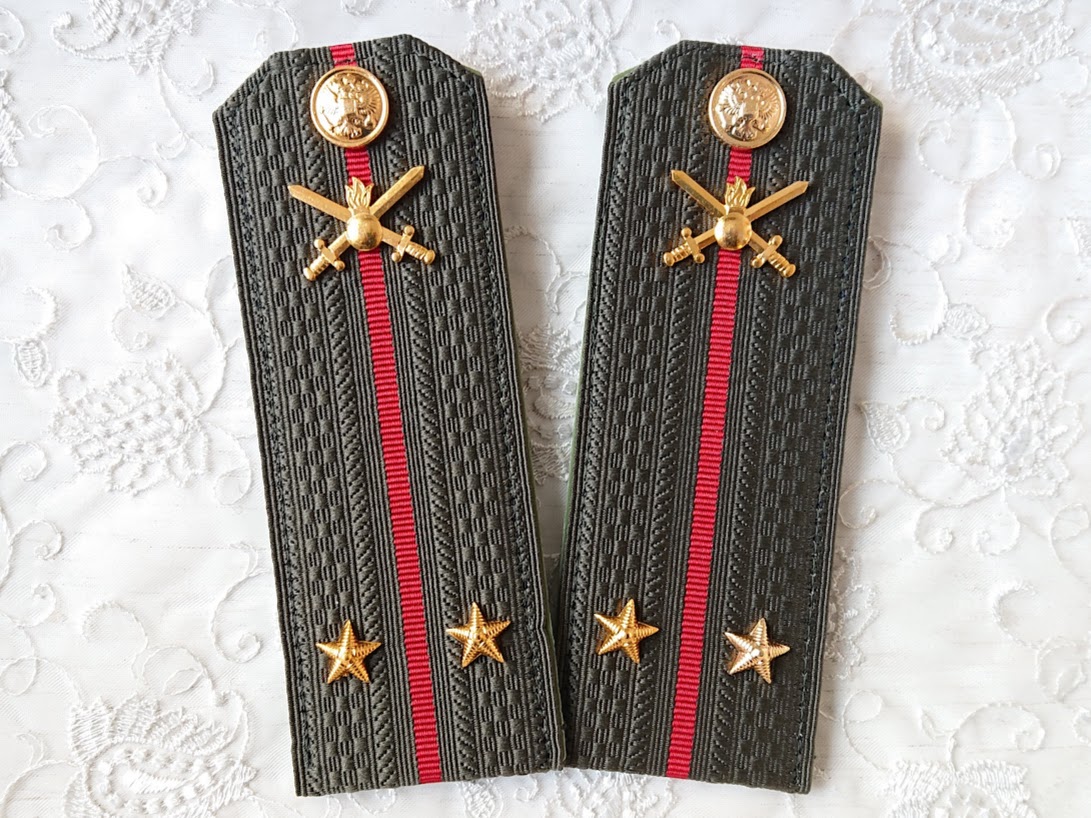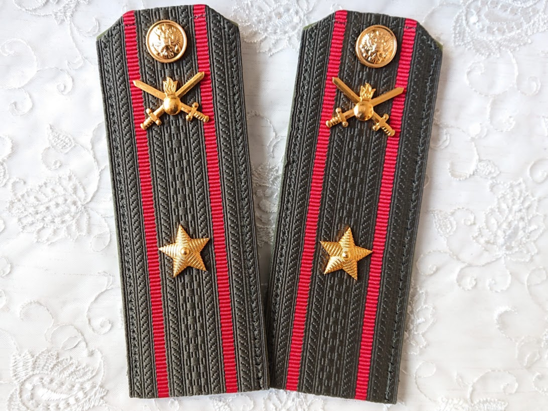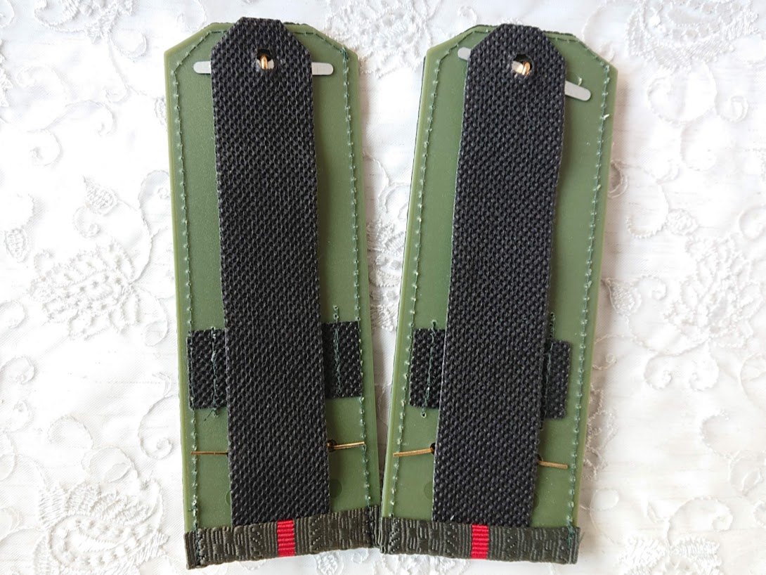 ロシア陸軍 常勤服用肩章2枚セットです。オリーブグリーンの階級章台座に、陸軍マークバッジ、階級を表す星章、そして制服に付けるための双頭の鷲レリーフのボタン(裏に留め具付)がついています。
