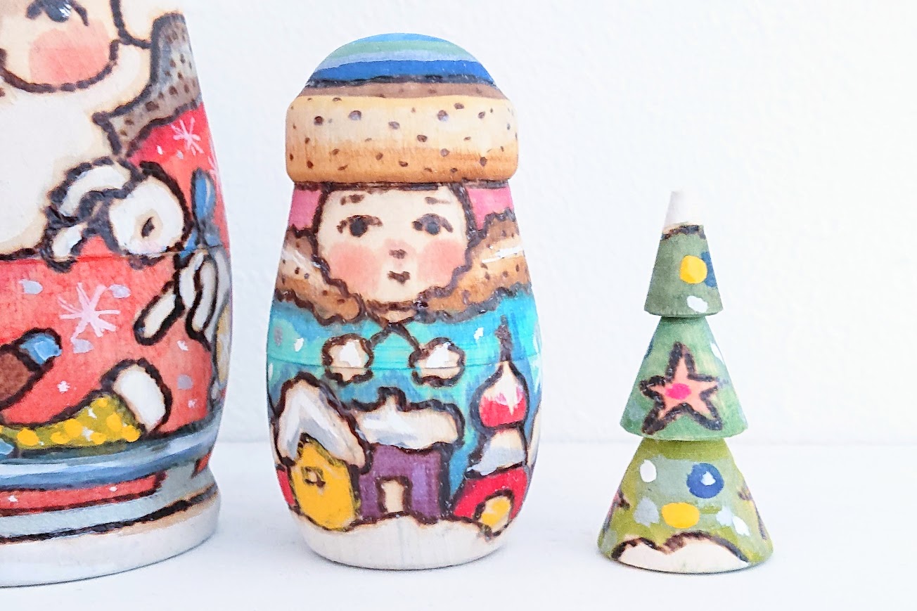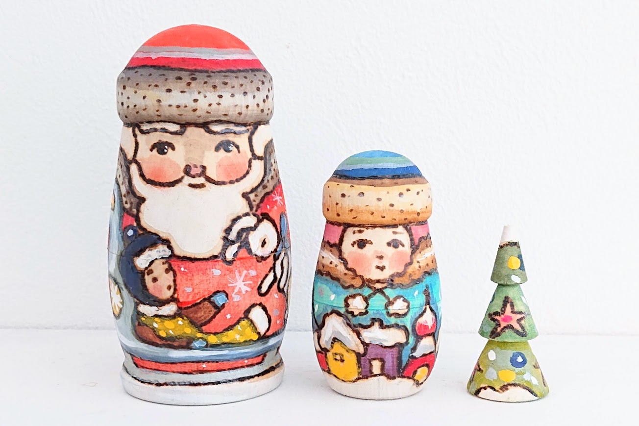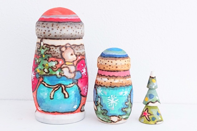 帽子をかぶった、リャボヴァさんのウッドバーニング・クリスマスマトリョーシカ 3ピース <ジェド=マロース・スニェグーラチカ・ツリー>です。