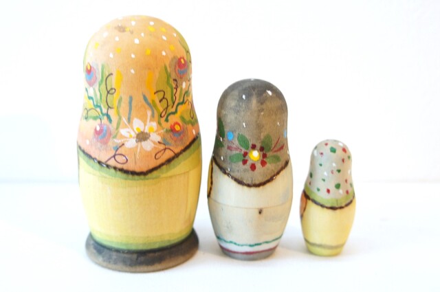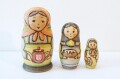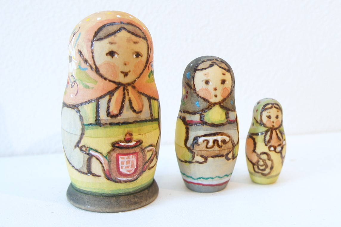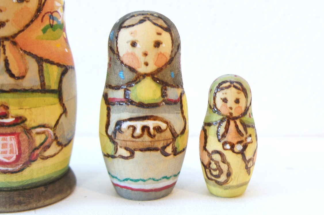 まぁるいお顔とちょっと憂いのある表情が印象的なリャボヴァさんのウッドバーニング・ひょうたん型マトリョーシカ 3ピース <ティータイム>です。