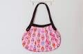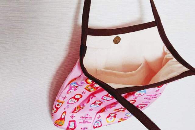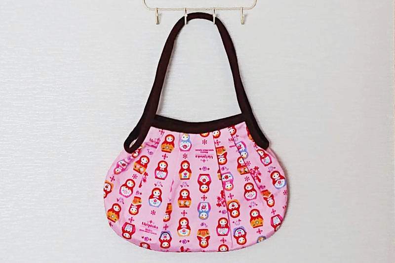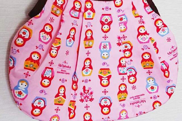 SAYURI さんがハンドメイドした、キュート!マトリョーシカ柄 ネスティング(入れ子)グラニーバッグ(M) <ピンク>です。ピンク地にかわいいマトリョーシカと鳥の柄がずらっと並ぶ、かわいいバッグ。ギャザーがあるため、見た目よりたくさん入ります。口はマグネットで閉じられ、中にはポケットもついていて便利!おでかけにぴったりのサイズです。