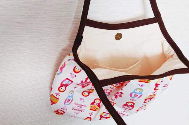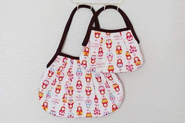 SAYURI さんがハンドメイドした、キュート!マトリョーシカ柄 ネスティング(入れ子)グラニーバッグ(M) <ホワイト>です。ホワイト地にかわいいマトリョーシカと鳥の柄がずらっと並ぶ、かわいいバッグ。ギャザーがあるため、見た目よりたくさん入ります。口はマグネットで閉じられ、中にはポケットもついていて便利!おでかけにぴったりのサイズです。