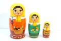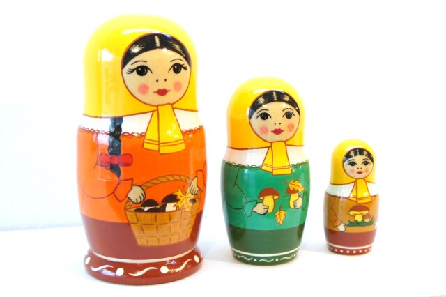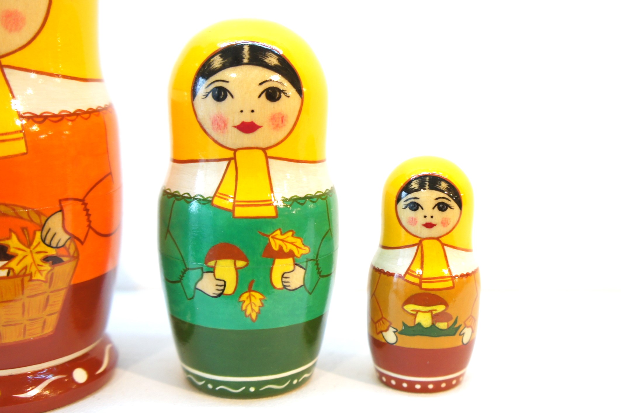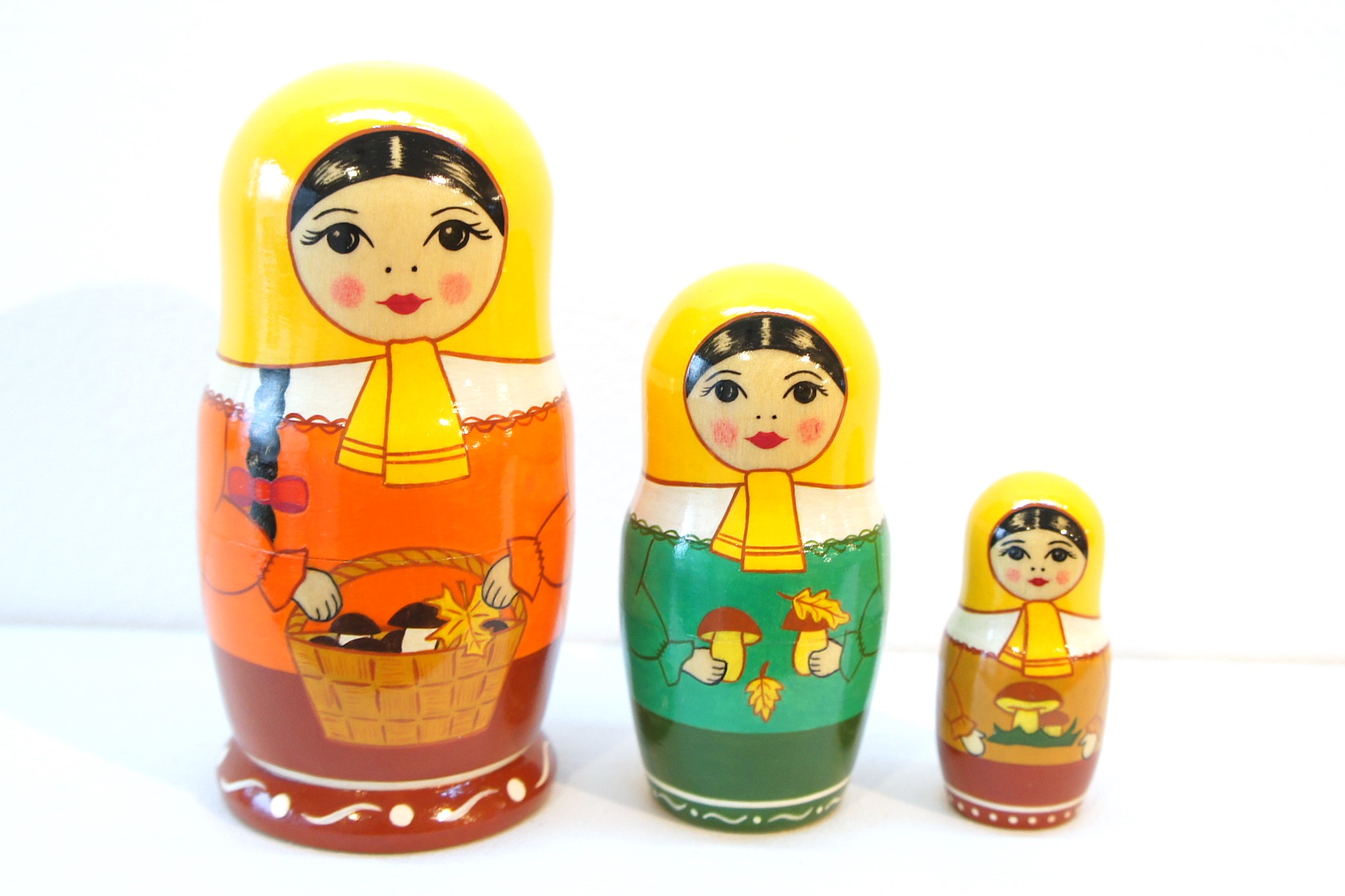 ツヤツヤに塗られたニスが美しい、シラーエヴァさん作、シラーエヴァ作 カラフル・マトリョーシカ<黄色ずきん/キノコ狩り> 3ピース です。