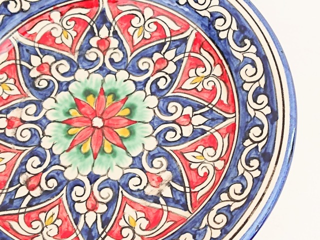 ウズベキスタンの工芸・リシタン陶器 円形皿です。リシタン(Rishton/Риштон)は、ウズベキスタン東部のフェルガナ州にある町で、古くから陶器の産地として知られています。ウズベキスタンの陶器の90%はリシタンで作られていると言われています。