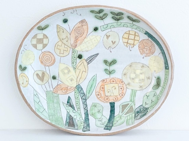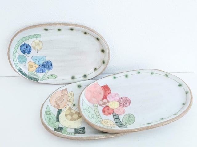 少し珍しい楕円のお皿ですが、使いやすい大きさで、ティータイムに役に立つことと思います。色も3色そろえていただけましたので、ぜひご友人の方々と楽しいお茶の時間をお過ごしください。