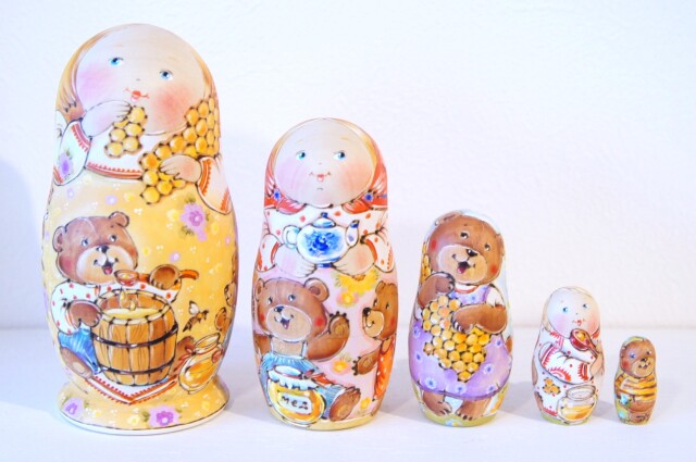 女の子もクマさんも表情豊かで、とても楽しそうです。見ている方まで楽しくなります。美しいマトリョーシカ!