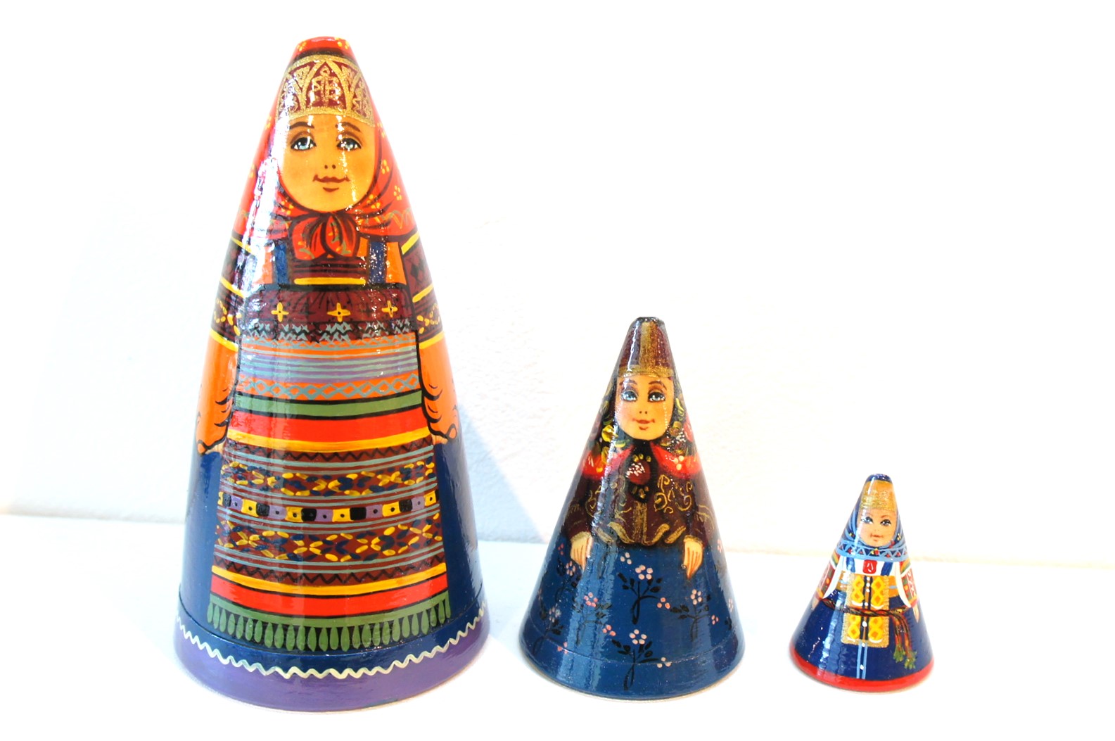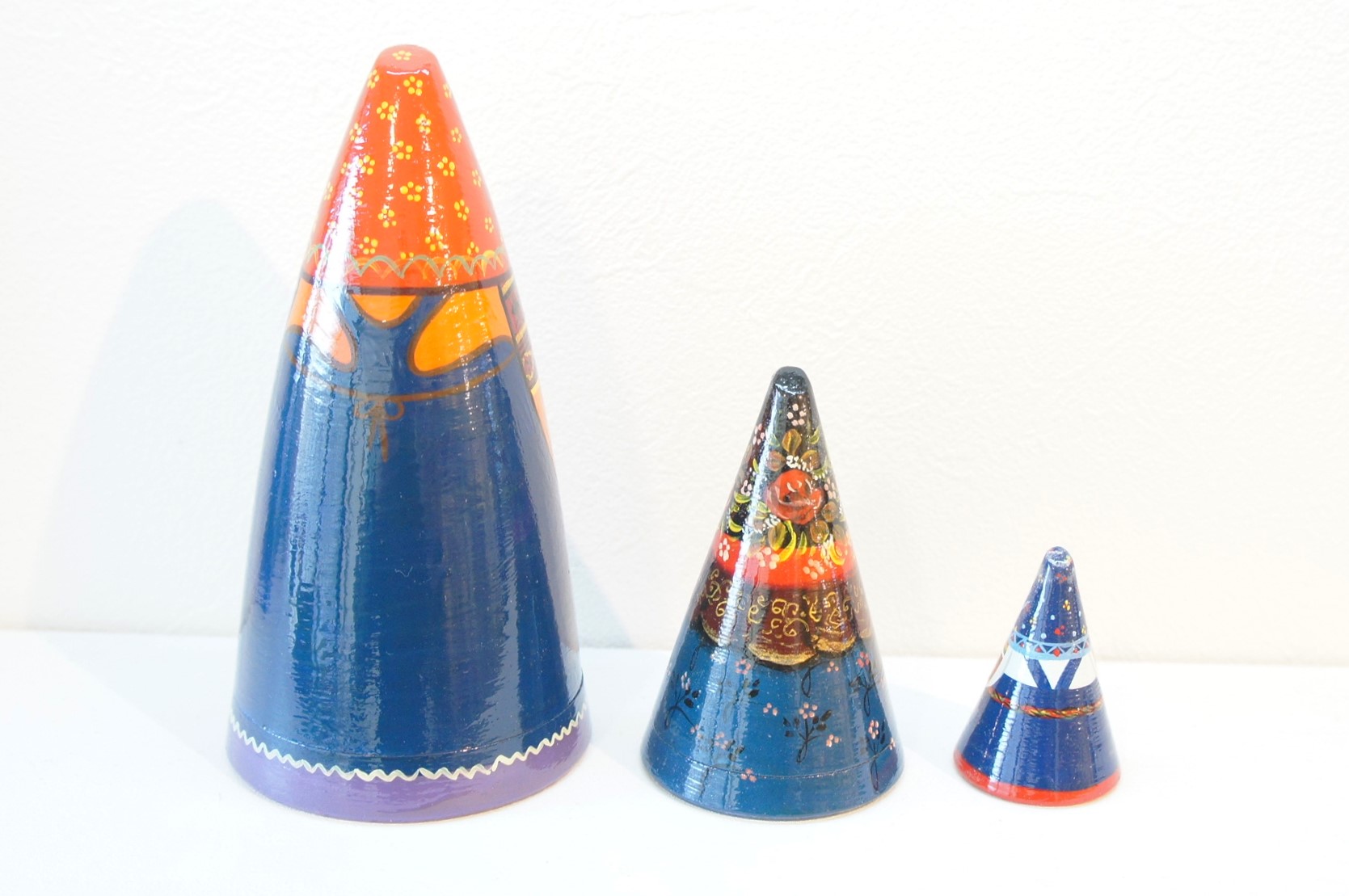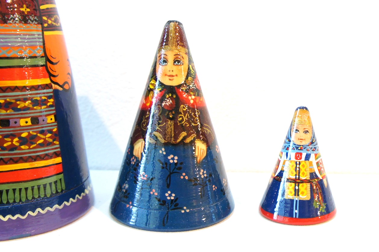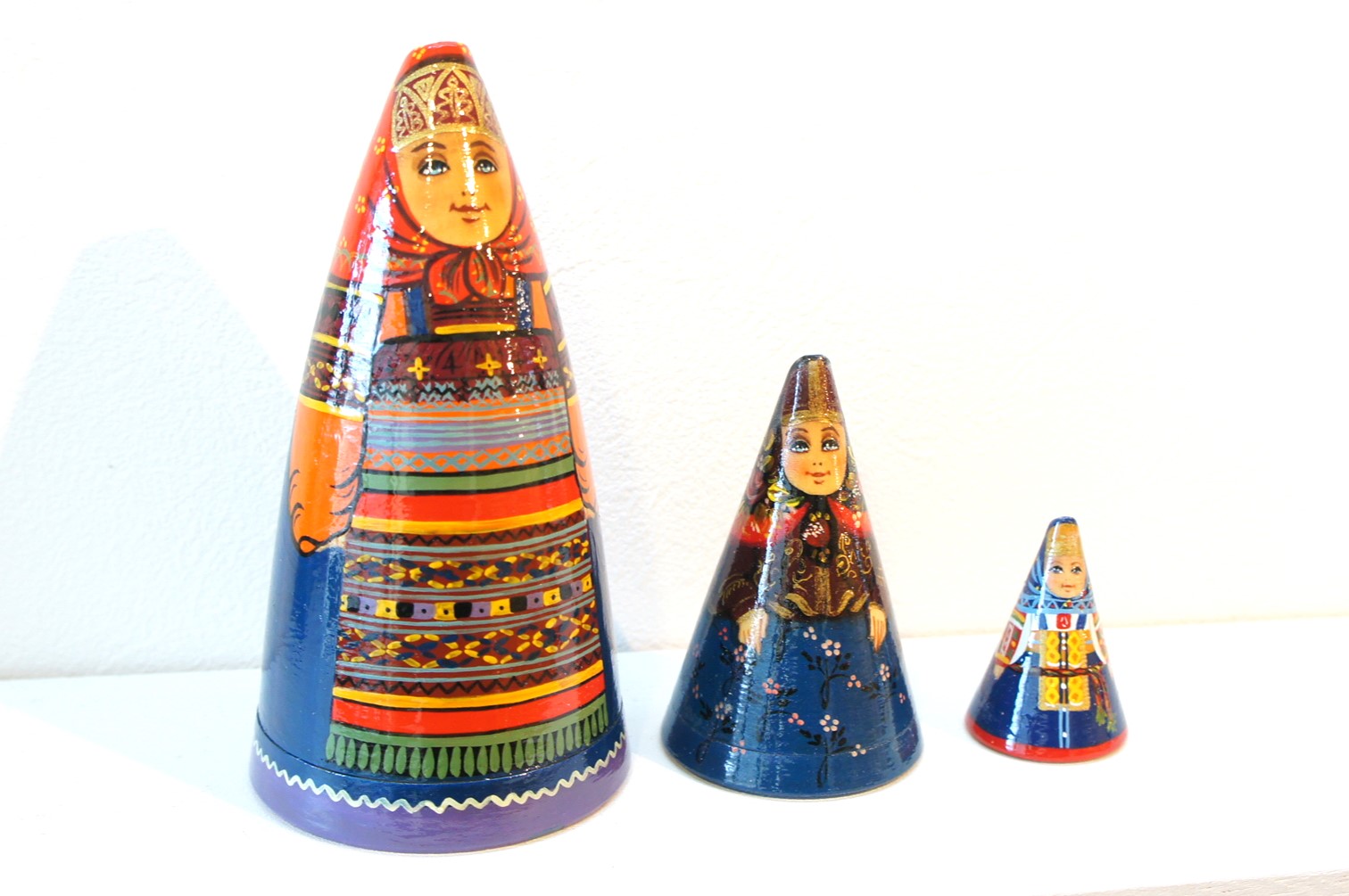 民族衣装マトリョーシカ 3ピースです。ロシアのいろいろな町に伝わる民族衣装が忠実に描かれています。細部まで再現された衣装は、民族衣装の専門家・ダラフェエヴァさんの作品ならでは。