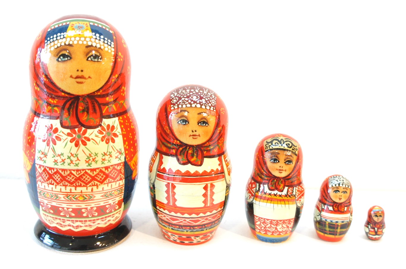 ダラフェエヴァ作 ダラフェエヴァ作 民族衣装マトリョーシカ 5ピース<カルーガ、オリョール、クルスク、トゥーラ、リャザン>です。細部まで再現された衣装は、民族衣装の専門家・ダラフェエヴァさんの作品ならでは。