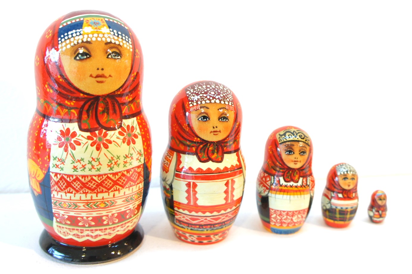 ロシアのいろいろな町に伝わる民族衣装が忠実に描かれています。それぞれのマトリョーシカの裏にはどの町の衣装かちゃんと記してあり、(日本語表記のシールを裏に貼付いたします)大きい順から