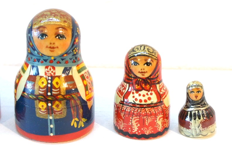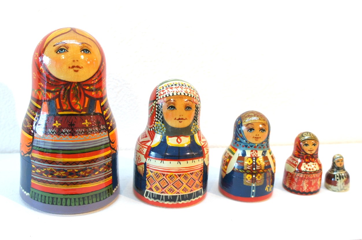 それぞれのマトリョーシカの裏にはどの町の衣装かちゃんと記してあり、(日本語都市名シールも貼付いたします。)大きい順から
