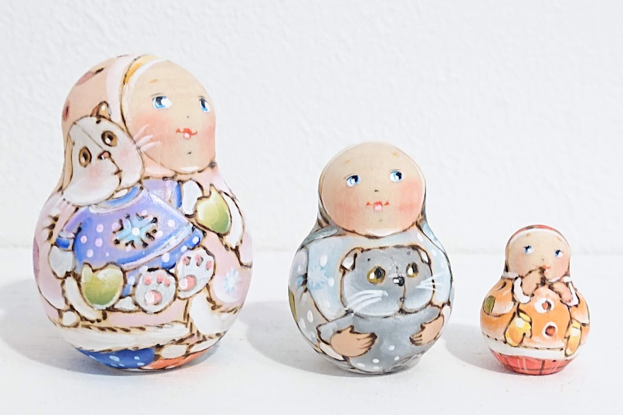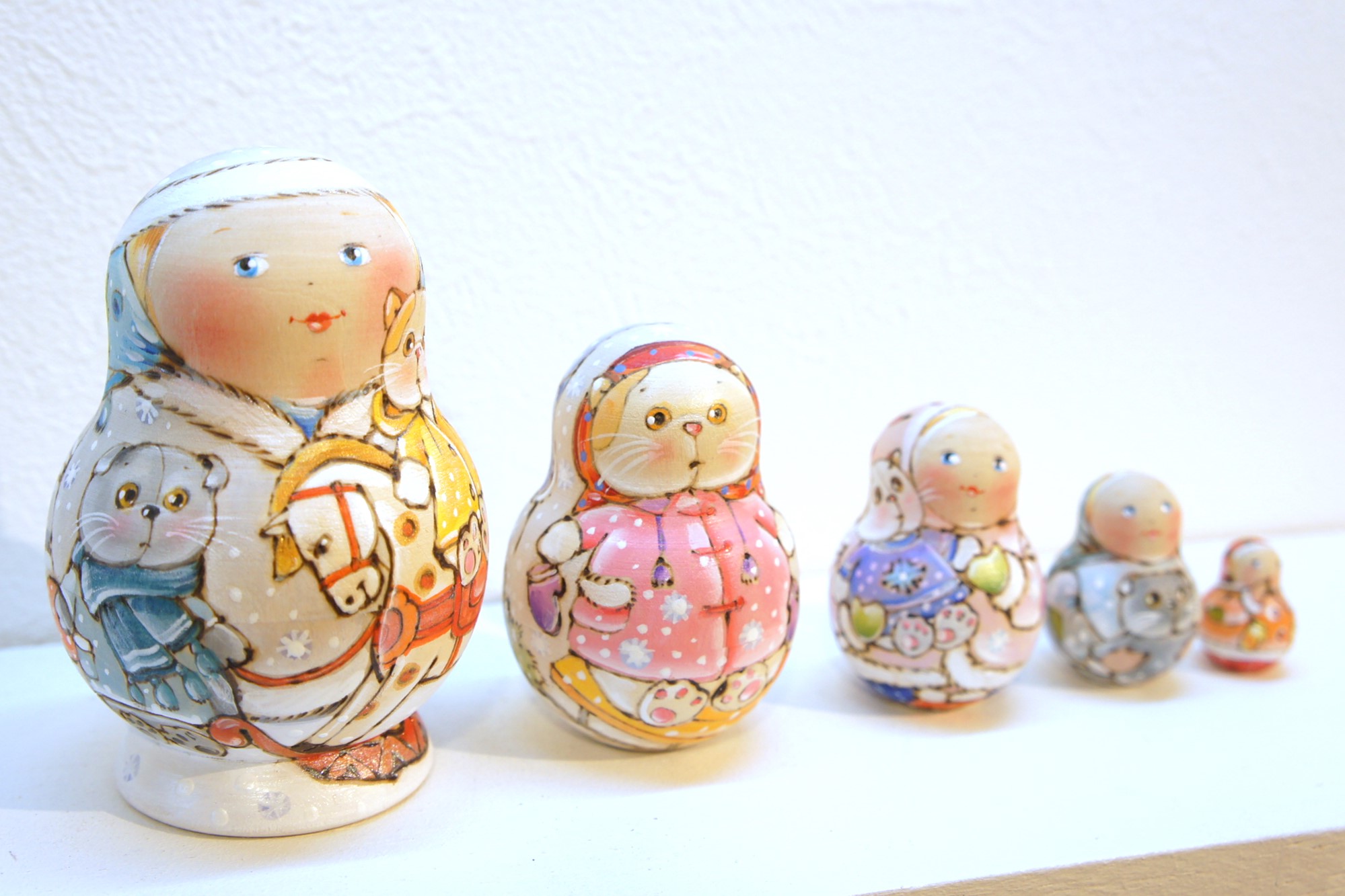 イリーナ・ヴァトゥルーシキナ作 ダルマ型マトリョーシカ 5ピース <ネコのぬいぐるみ・バーシックとリリと木馬>です。2026年の干支である