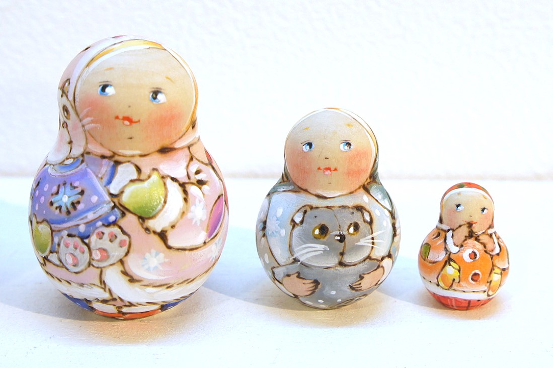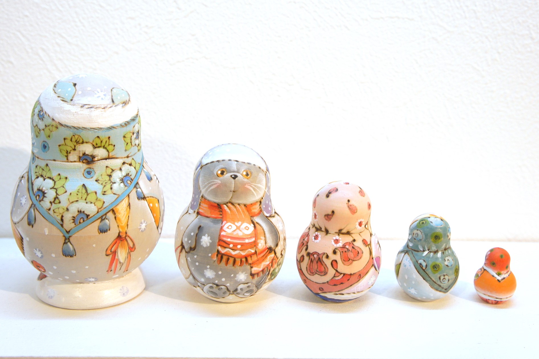 このマトリョーシカに描かれているグレーのスコティッシュフォールドのネコは