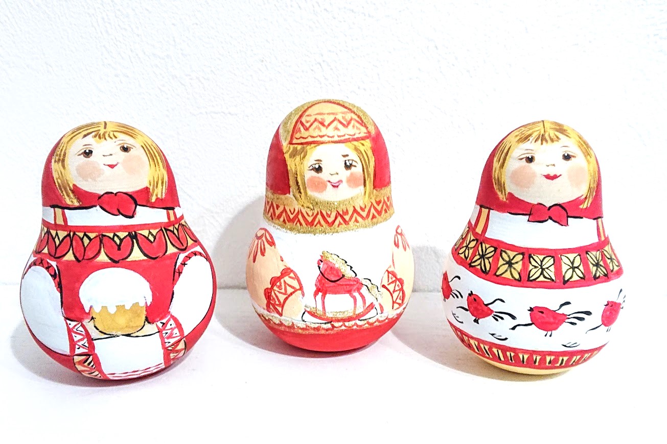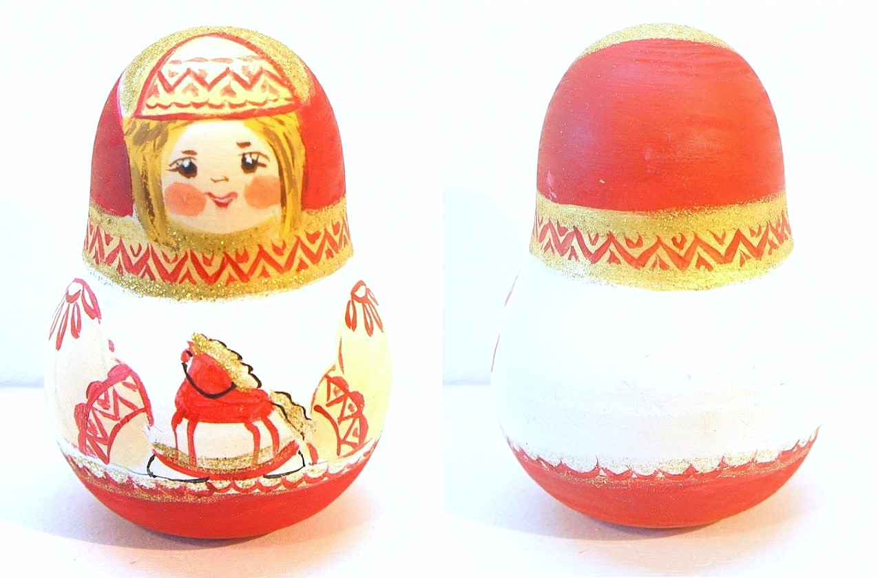 マルンコーヴァ作 メゼーニ塗り 赤ずきんちゃんネヴァリャーシカ(起き上がりこぼし)です。揺らせば、カラーンコローンと