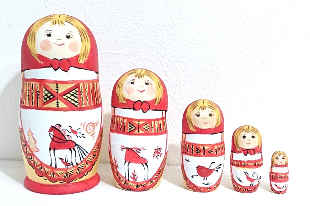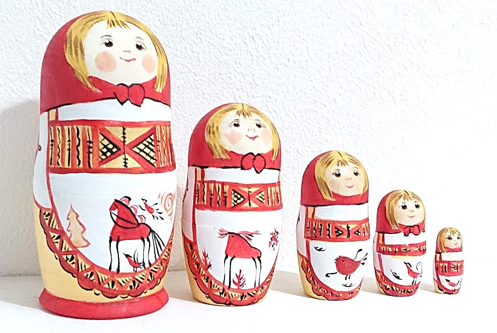 マルンコーヴァ作 メゼーニ塗り 赤ずきんちゃんマトリョーシカ Sサイズ 5ピース <メゼーニの動物たち>です。表情がなんとも癒し系で、見ていると思わず笑顔になってしまいます。