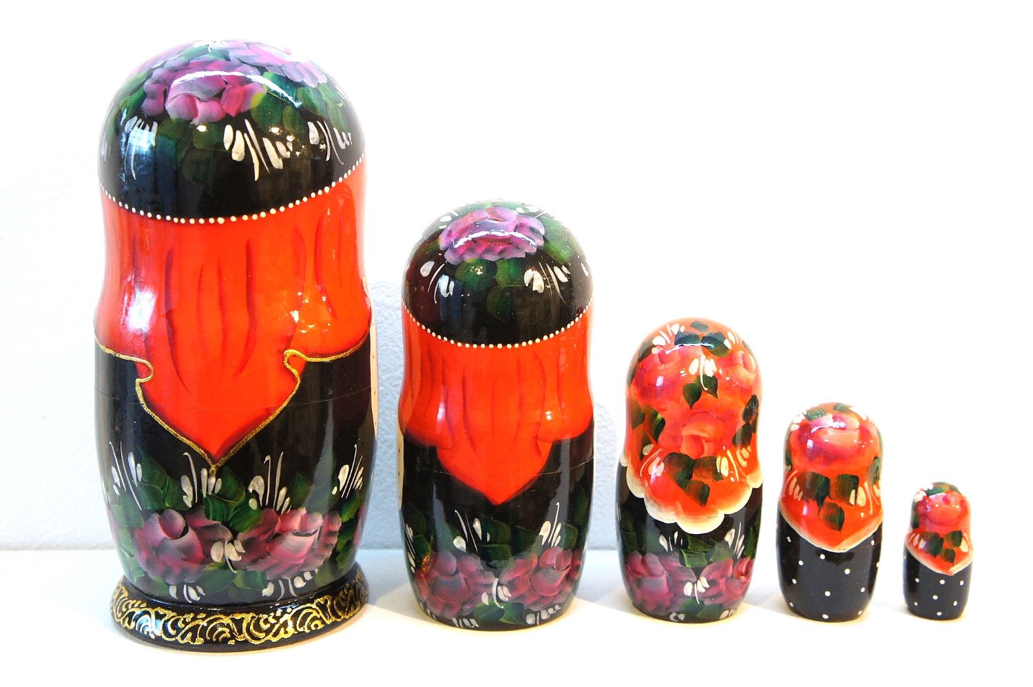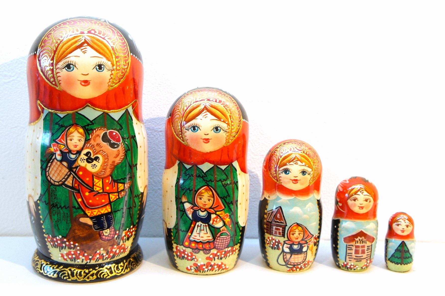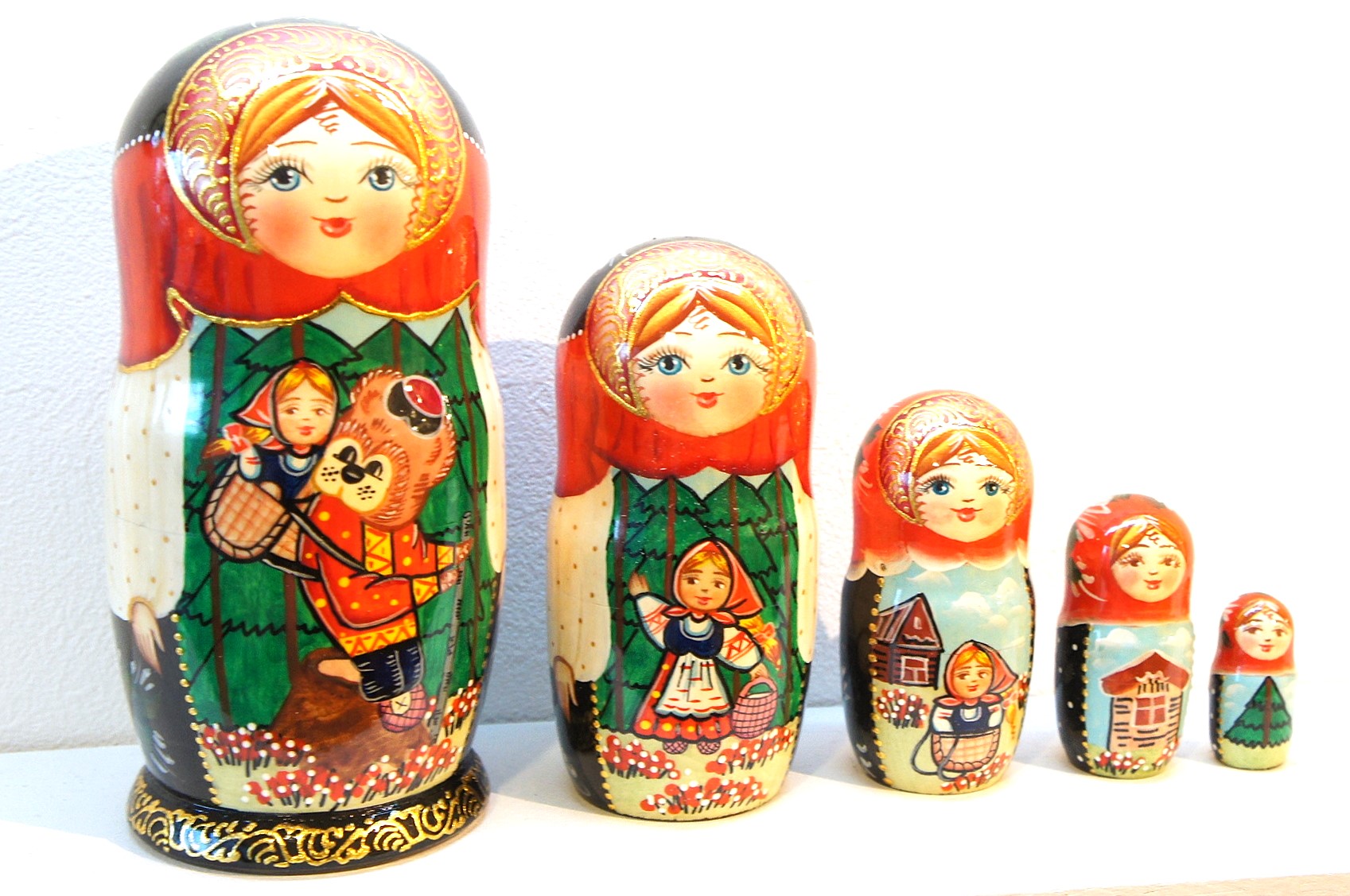 ロシア民話マトリョーシカ「マーシャとくま Маша и Медведь」 5ピース <レッド&ブラック>です。