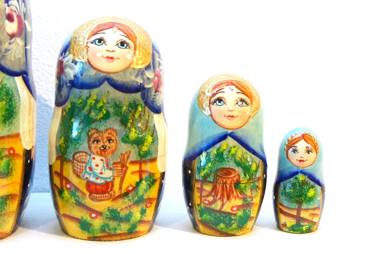 ロシア民話マトリョーシカ「マーシャとくま Маша и Медведь」 5ピース <水色&ブルー>です。